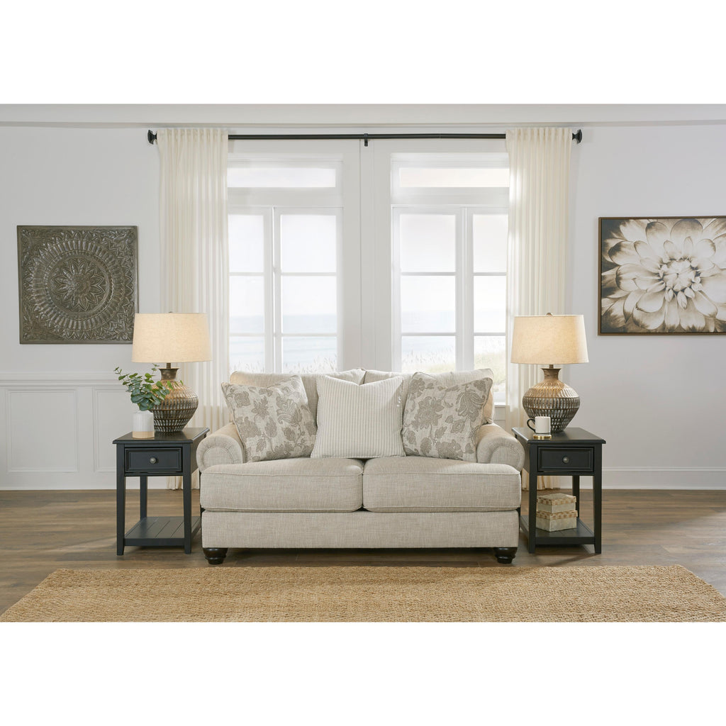This sofa, loveseat and ottoman set has an alluring look that's guaranteed to turn heads. Richly textured fabric in a... This sofa, loveseat and ottoman set has an alluring look that's guaranteed to turn heads. Richly textured fabric in a light, easygoing hue is enhanced by even lighter flax peeking through. Distinctive roll arms add a dab of debonair, while indulgently plush cushions cradle you softly. Sit back and relax in comfort and style, with plenty of room to stretch out and unwind at the end of a long day. View more