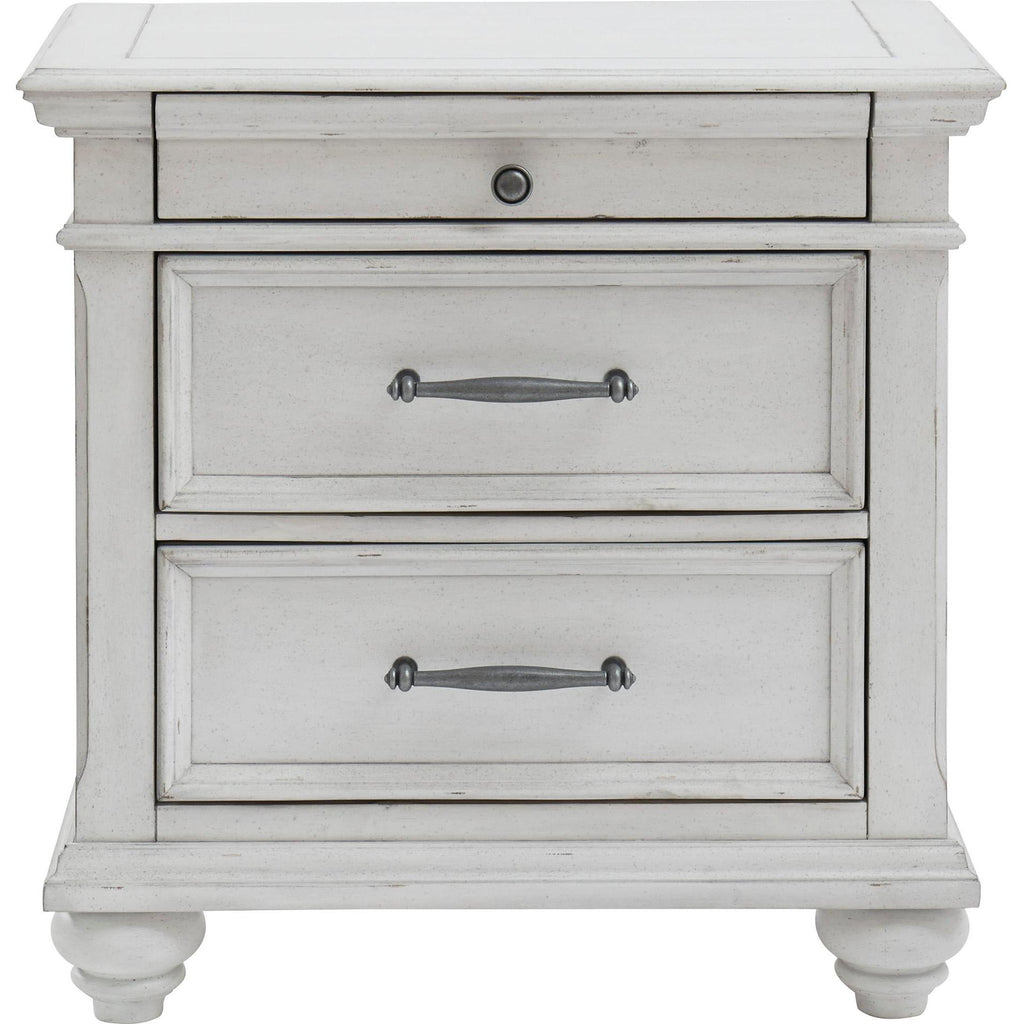 Give your retreat vintage charm with this queen panel bed and storage footboard. In a beautifully distressed whitewash finish, you'll... Give your retreat vintage charm with this queen panel bed and storage footboard. In a beautifully distressed whitewash finish, you'll love the headboard's grand style featuring a picture framed panel. The bench footboard is equally elegant offering extra storage and a convenient seat. Generously scaled moulding from top to bottom, along with bun feet give this bed character—evoking the feel of a quaint cottage escape. Dresser, mirror and nightstand also included. View more