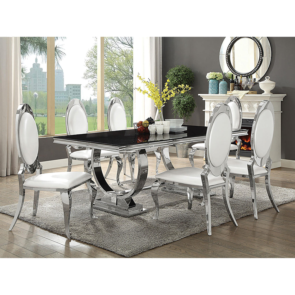 • This collection with polished chrome and black marble finishes is perfect for a luxurious and modern dining space