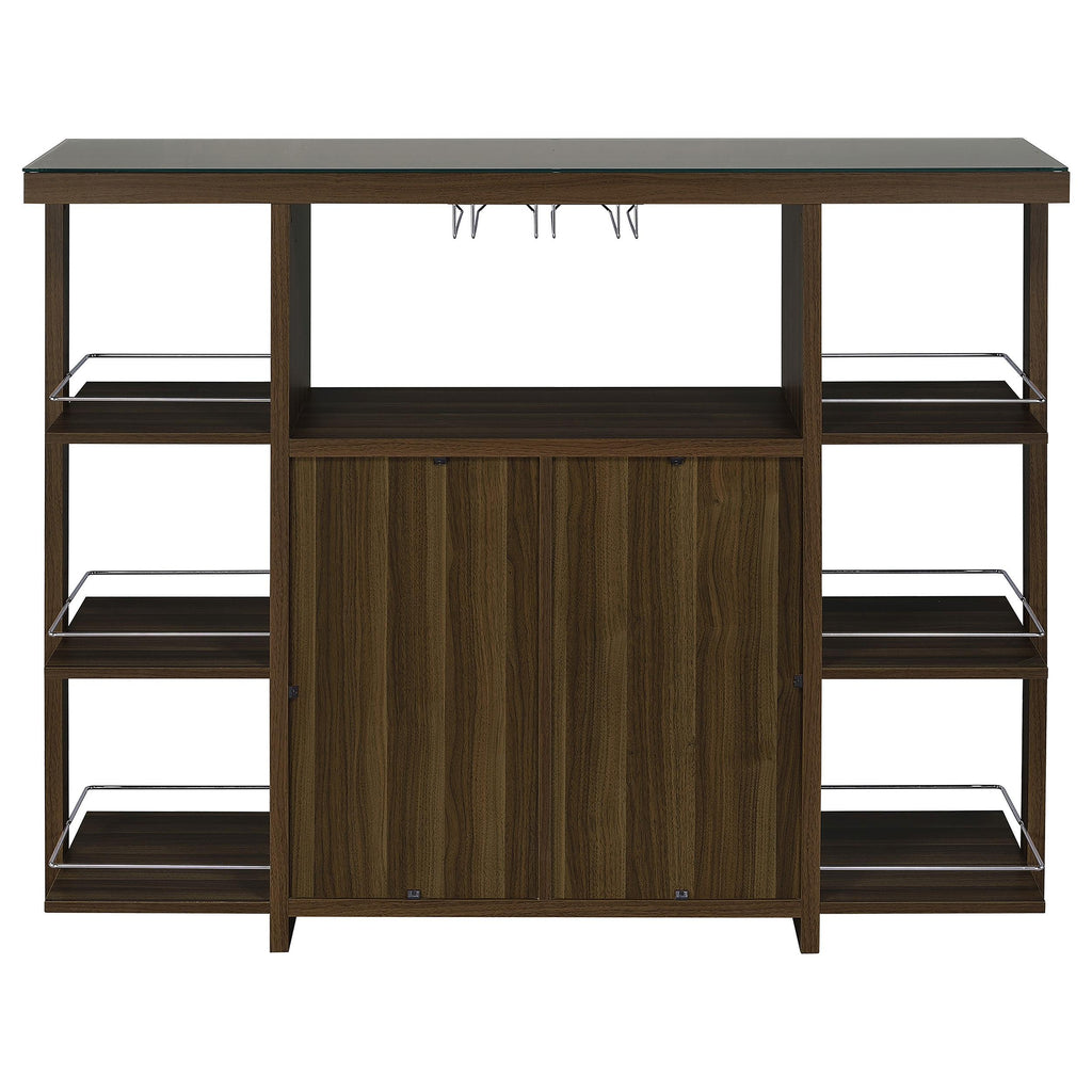 • Modern bar cabinet with walnut finish sets the tone for any room you choose