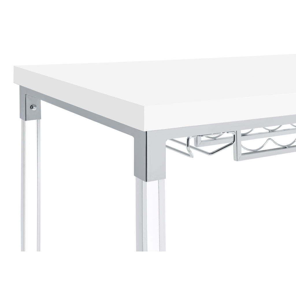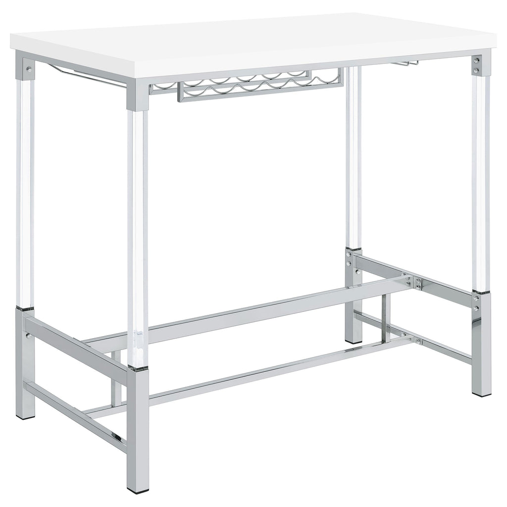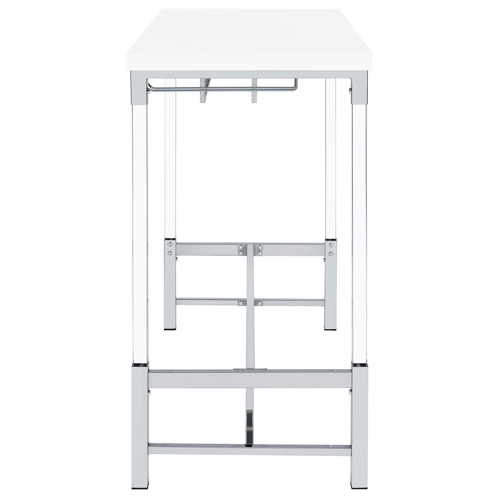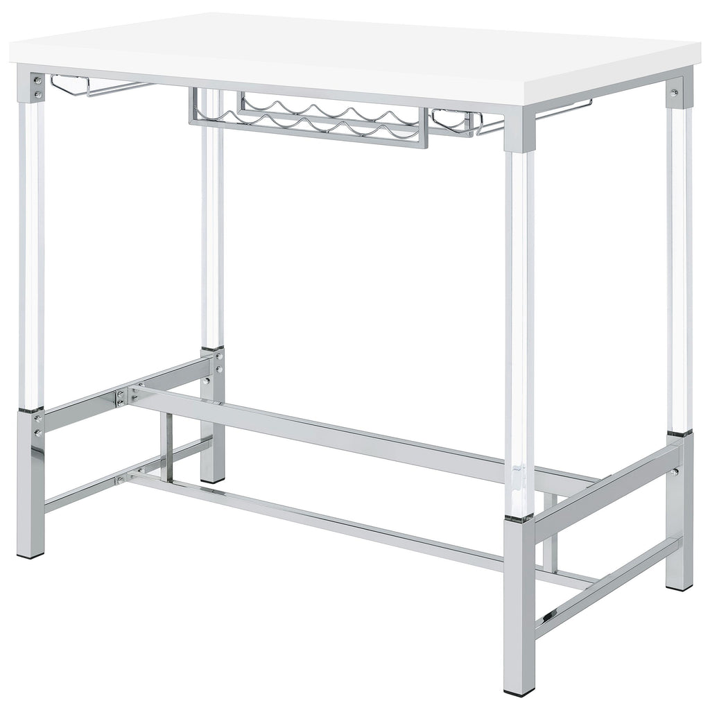 • A chic bar table offers ample storage and stylish appeal with acrylic legs