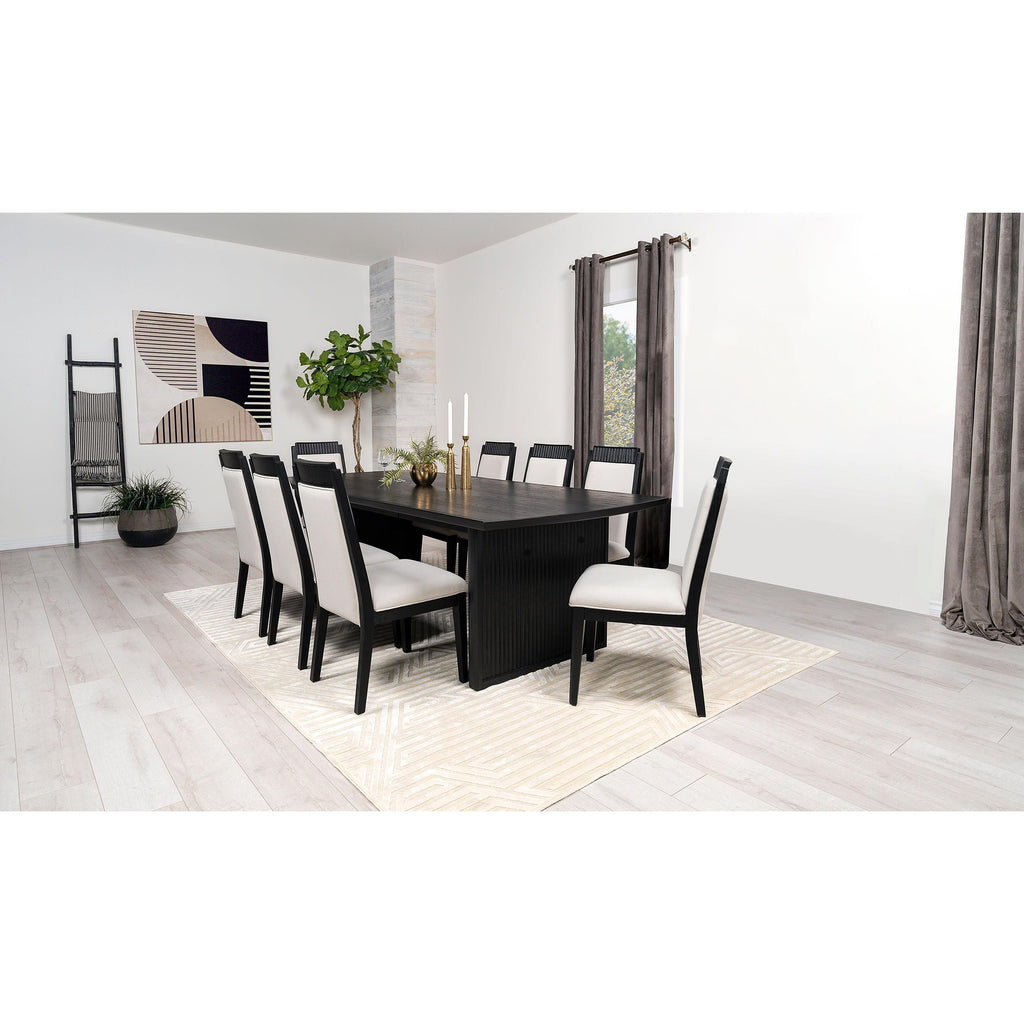 A notable color contrast and ultra-dramatic look make an impact in your modern or transitional dining space, creating a focal... A notable color contrast and ultra-dramatic look make an impact in your modern or transitional dining space, creating a focal point worthy of consideration. This nine-piece wood and fabric dining set is adaptable to embellish a host of settings important to your everyday living. Distressed black finish wood construction on all pieces gains attention to a minimalist table design with straight, flat leg sections under a sleek top with linear silhouetting and a dimensional top chamfer curving along its edges. Chairs offer a clean silhouette with black finish wood framing, tapered legs, and ornate notched tops with linear carvings thrown in for extra dimension. Soft ivory fabric upholstery is intriguingly placed on both sides of top cushions and over a padded seat. View more