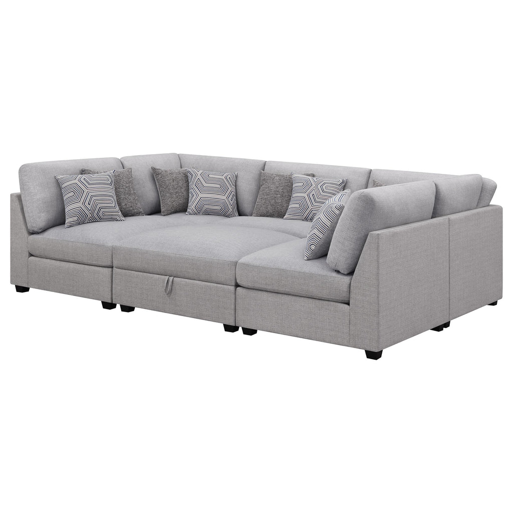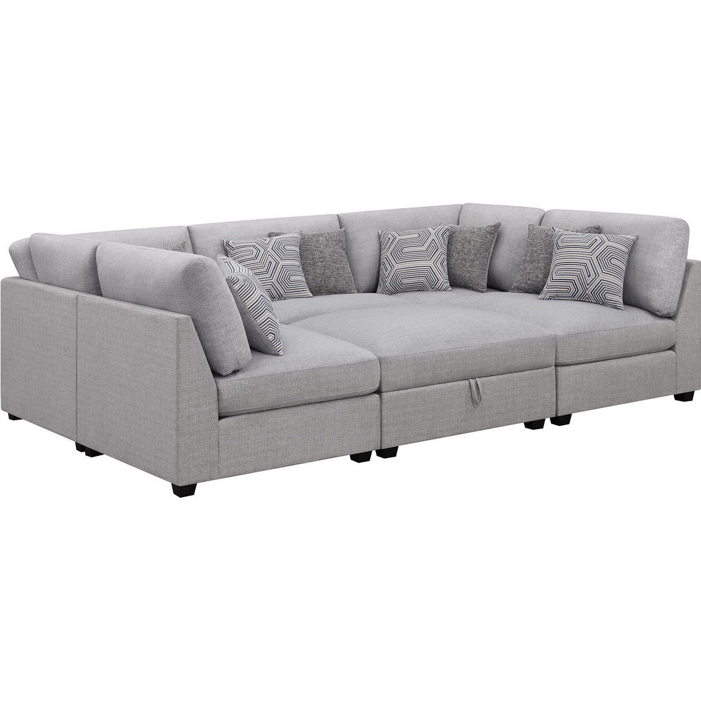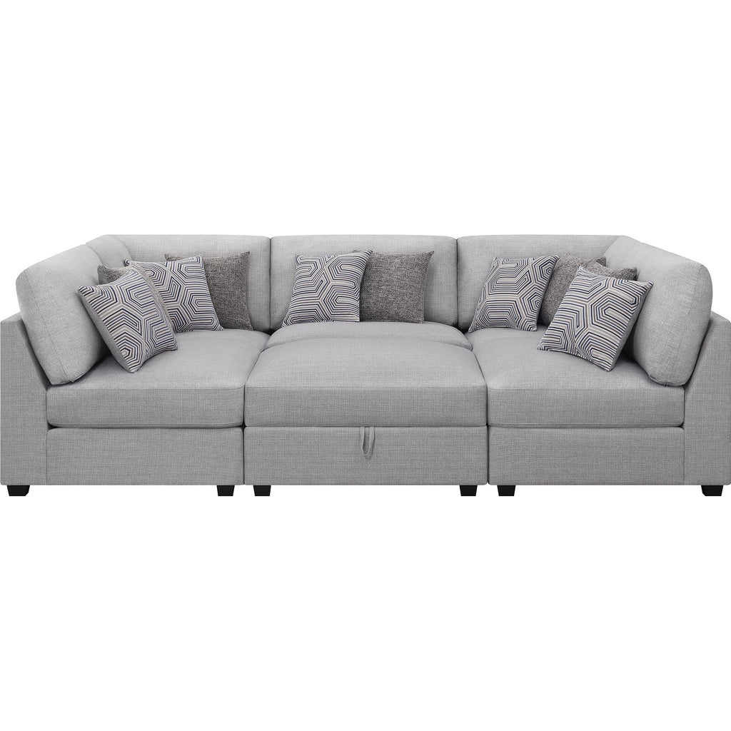 • Enjoy a cozy and inviting ambiance with a contemporary modular sectional sofa set featuring on-trend gray fabric upholstery and complementary patterned accent pillows