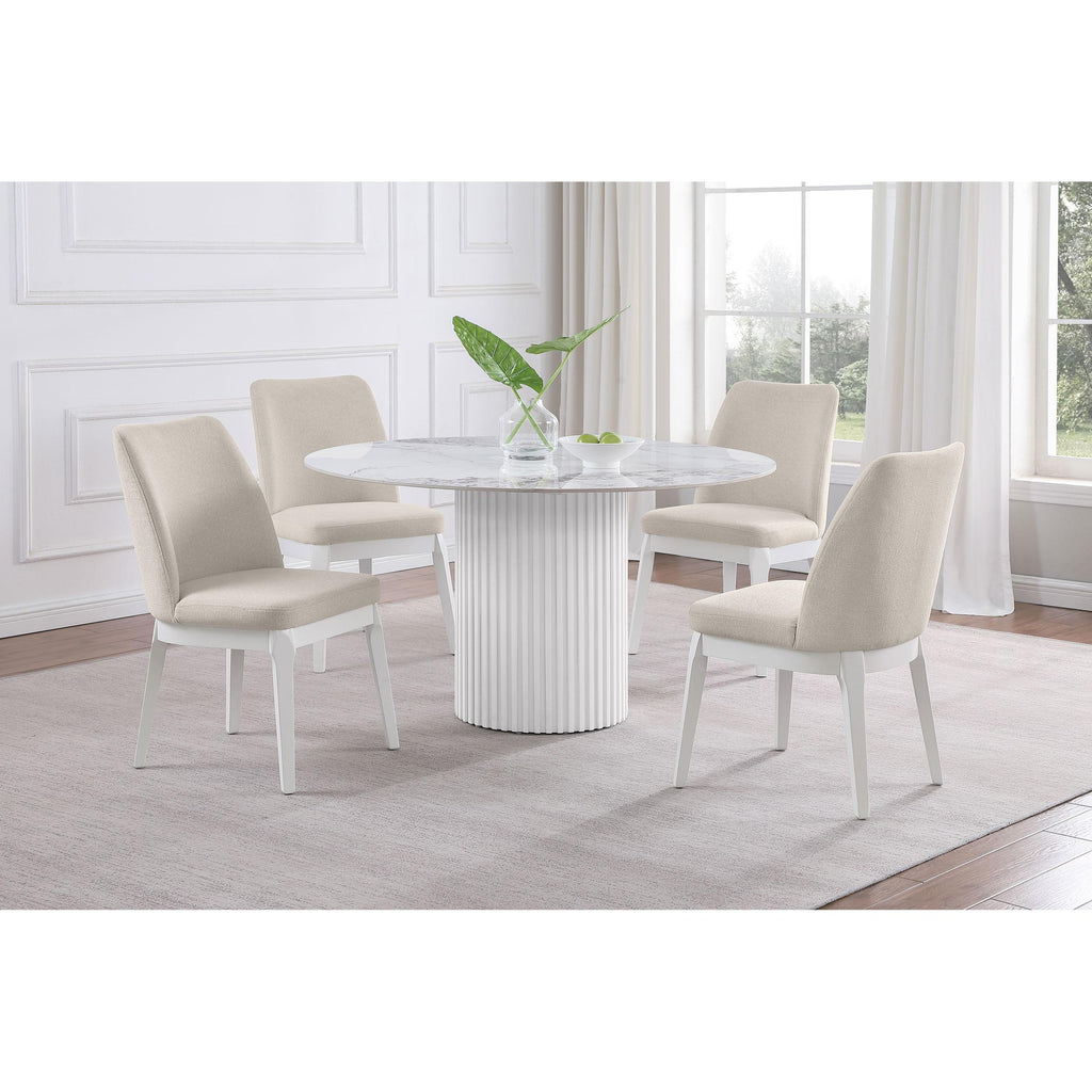 • A timeless stance highlights a set of two modern side chairs for a kitchen or dining room table