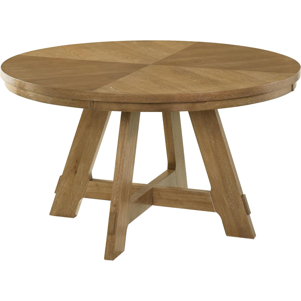 Infuse your kitchen or dining room with the inviting warmth of a modern farmhouse dining set that includes a round... Infuse your kitchen or dining room with the inviting warmth of a modern farmhouse dining set that includes a round table and four side chairs. The set is designed for casual enjoyment and vintage style, complete with a starburst wedge veneer pattern on its charming tabletop. The base of the table adds thick supports, including flared legs and crossing stretchers enhanced with joinery details. The set is ideal for a compact space, seating four comfortably with its 54-inch tabletop diameter. Its brown oak wood finish extends to four side chairs, each with a ladderback and padded seat covered in latte finish upholstery for a versatile look. This set includes one dining table and four side chairs. View more