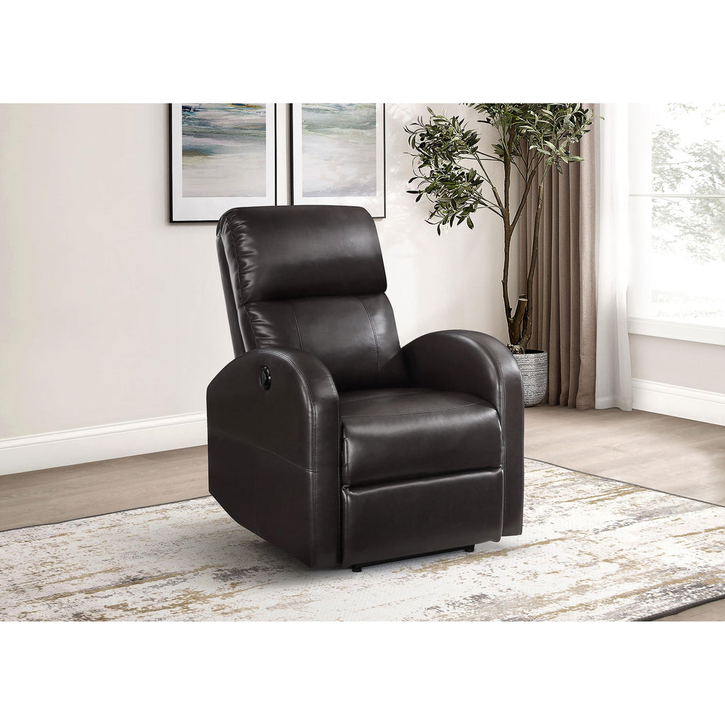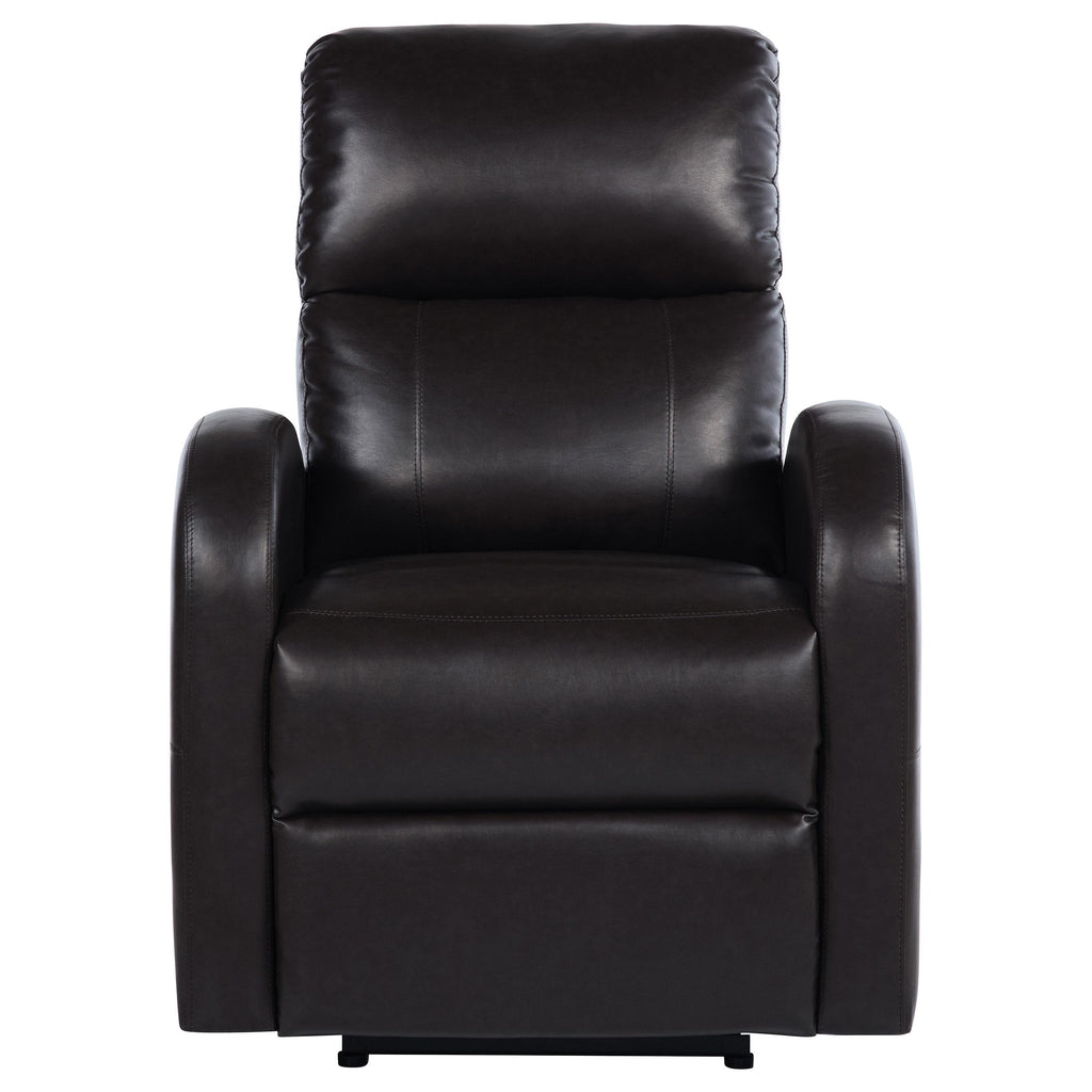 • Faux leather upholstery is smooth and sleek, in a neutral color that blends into surrounding decor