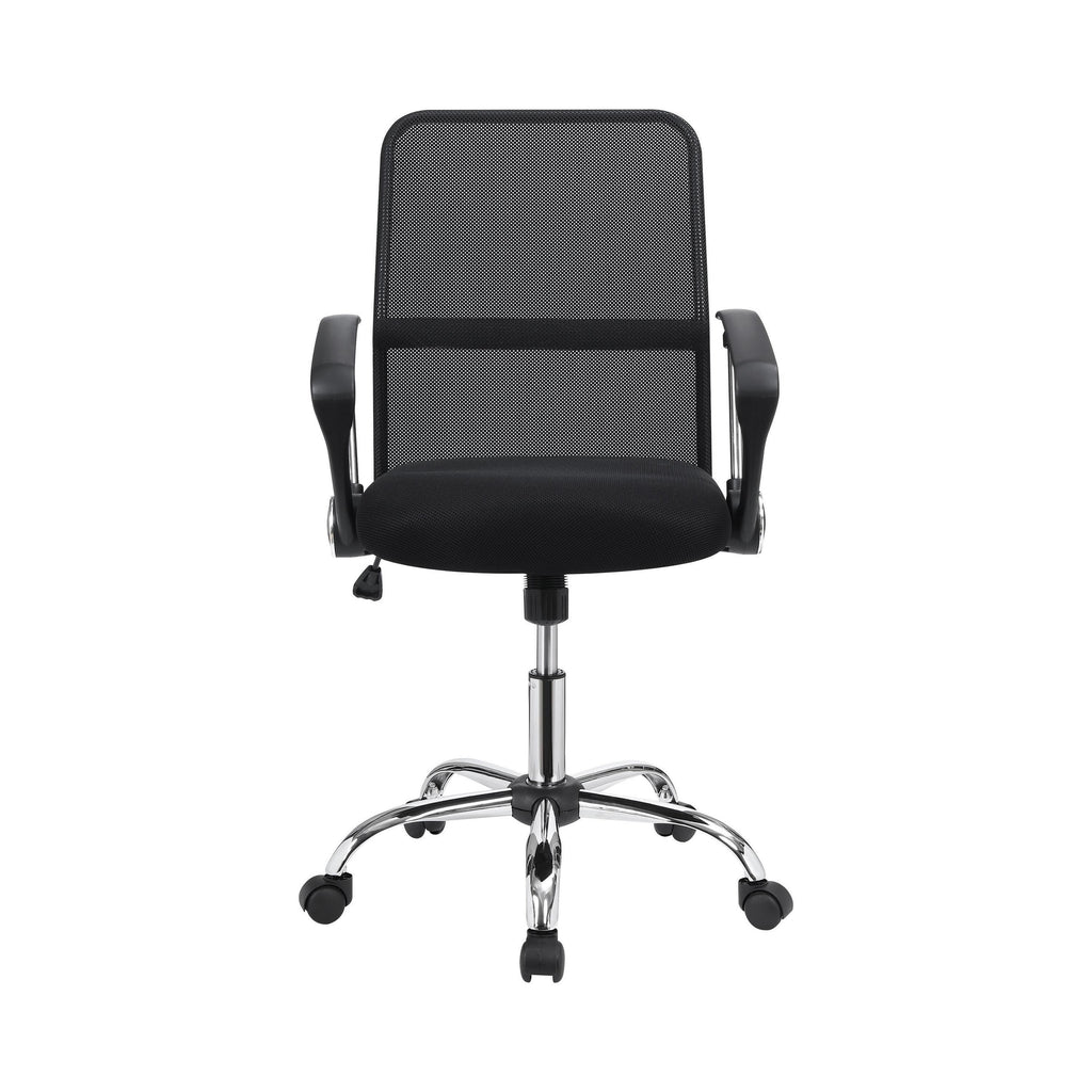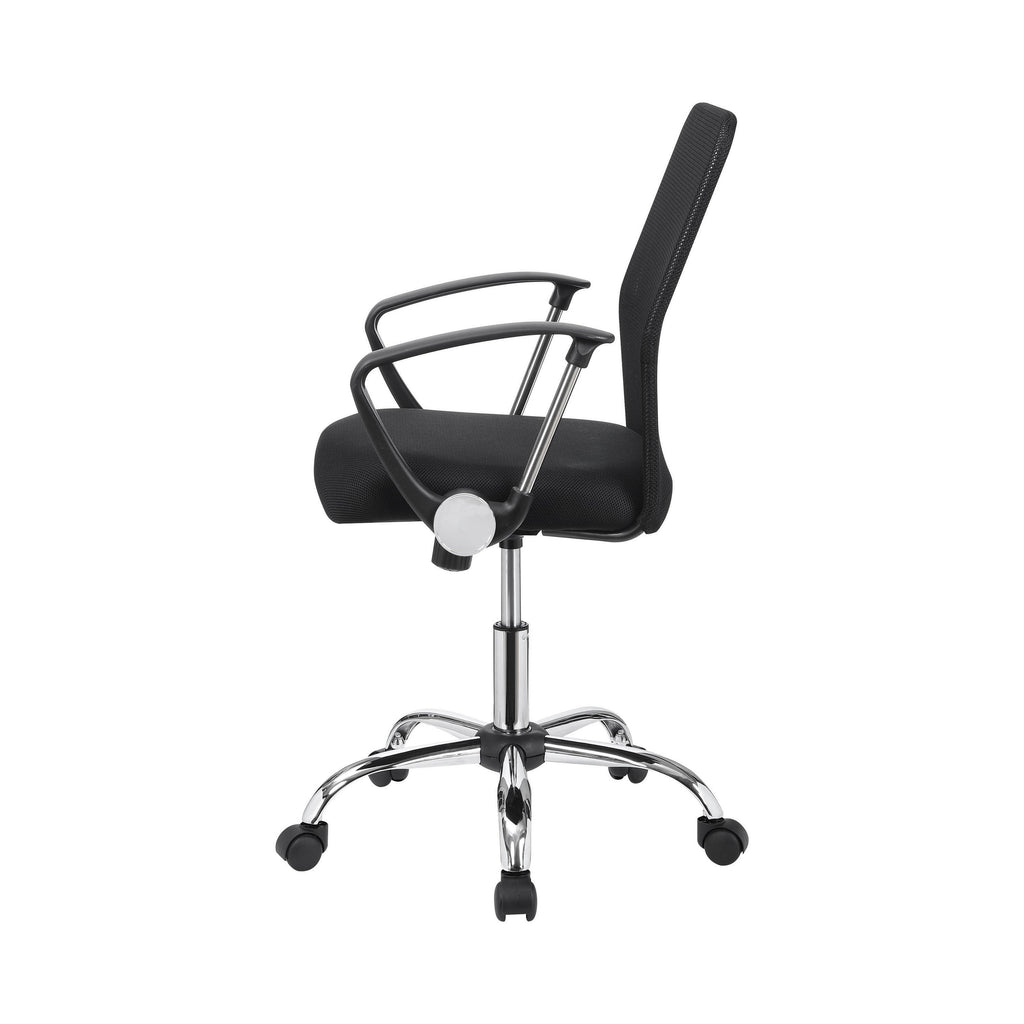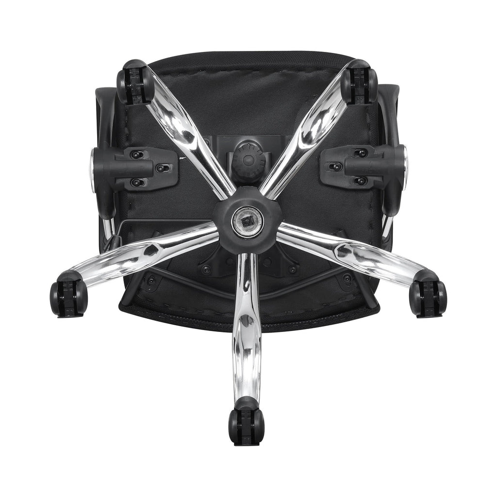 • Sleek black fabric paired with a shiny chrome base enhances office aesthetics