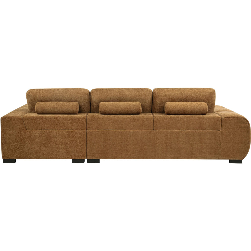 • Sectional in amber fabric features a sculpted right-side chaise for extended lounging