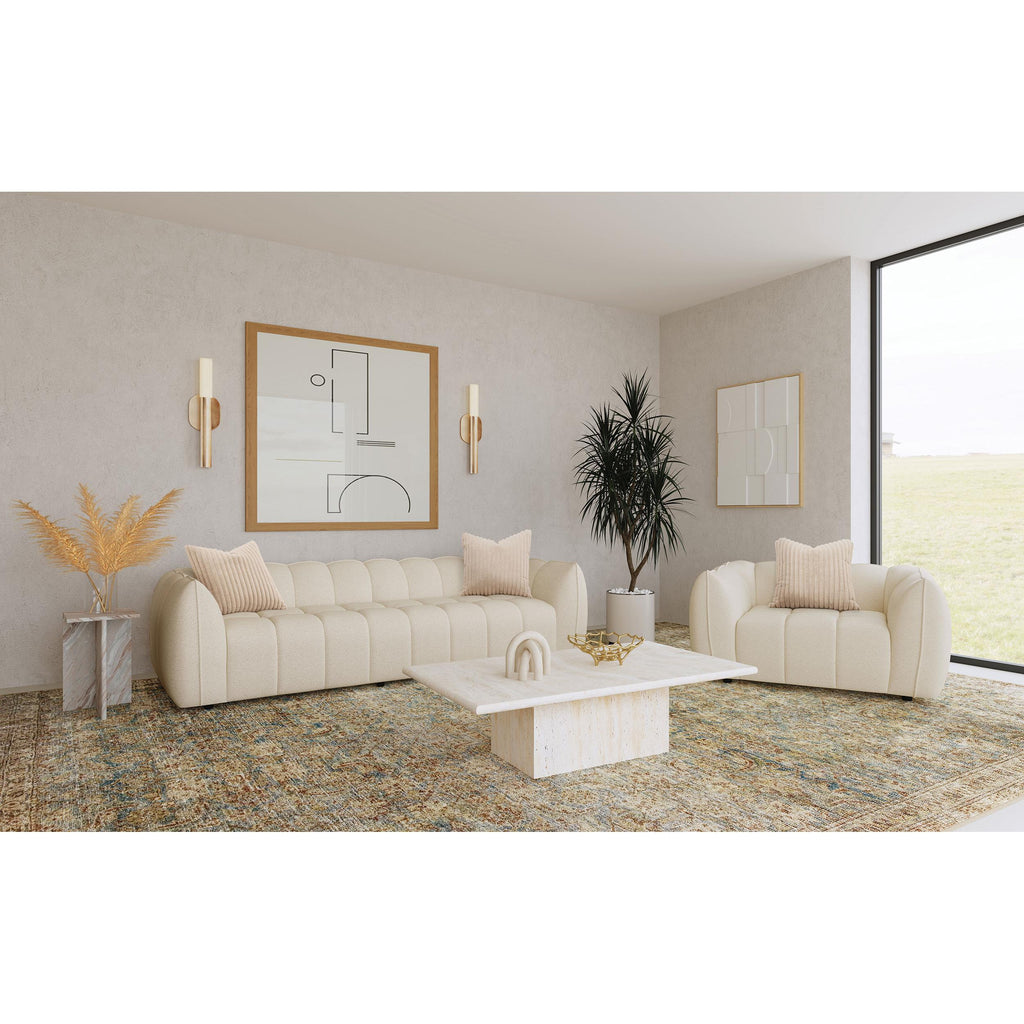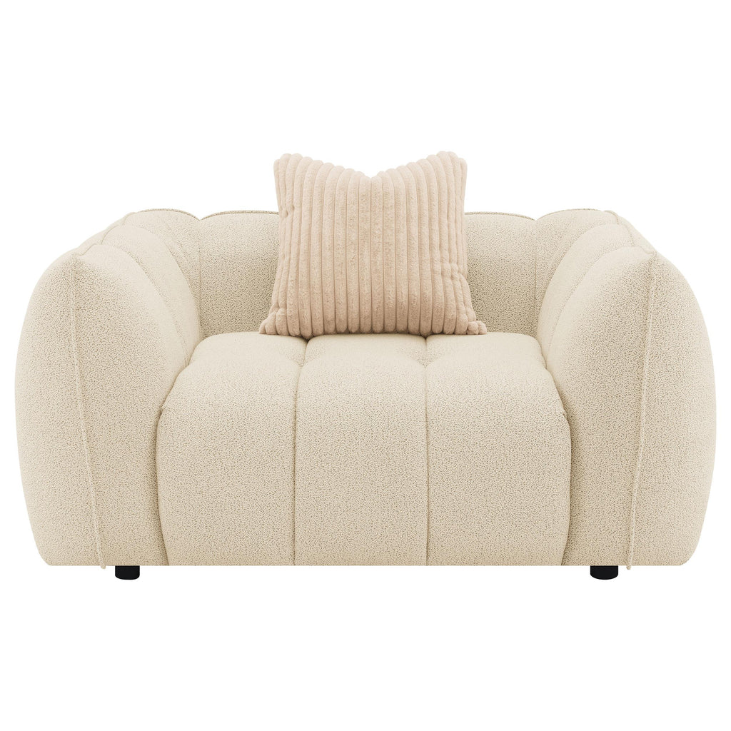 • Sand pebble boucle upholstery is soft and textured, with a neutral hue that adds warmth