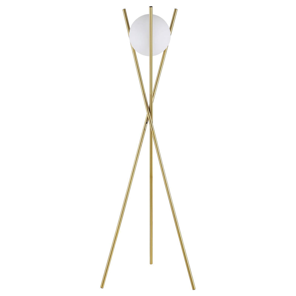 • Crossed rods form a tripod base with a round frosted white glass shade to filter ambient lighting