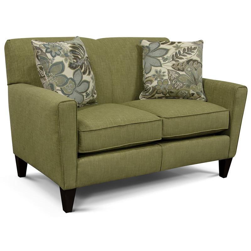 Coil cushions are optional at a small upcharge; Two 20" throw pillows (with a fringe option) come standard; The tapered legs in a dark brown finished wood are 2.75 x 6" screw-in; Welt is matching; Two cushion loveseats