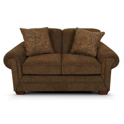 Seat depth: 22"; Seat height: 21"; Seat width: 43"; Coil cushions are optional at a small upcharge; Matching welt; Legs are 5.5 in x 5.5 in x 3 in H Bolt-On with medium brown finish; Two 20 in pillows (with a fringe option) are standard