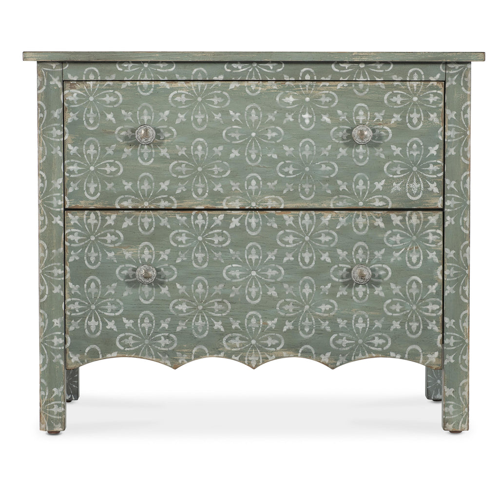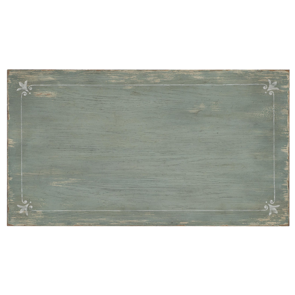 • Finish: Antique green finish with distressing and rub-through. The nightstand also features a white finished scroll pattern. Metal alloy knob pulls in an antique pewter finish with white hang-up.