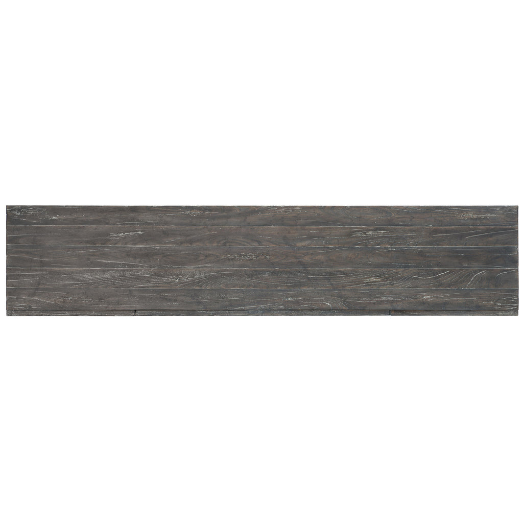 • Finish: Shale: a soft grey with natural wood undertones. Mottled copper hardware. Distressing includes rasping, chopping, gouging and wormholes.