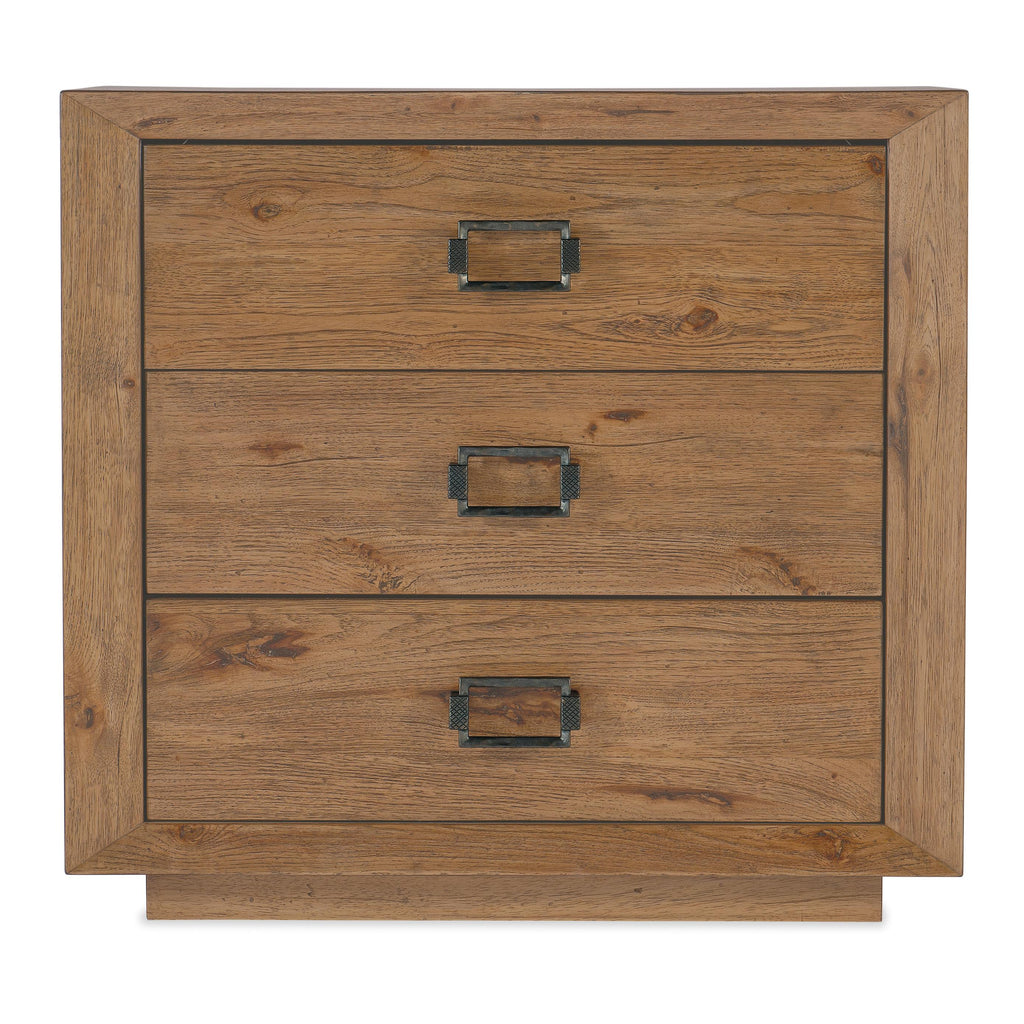 • Finish: Vintage Natural: a warm, rustic, organic finish over hickory veneers. Distressing includes chopping, rock, drawknife, gauging, chain distressing and wire brush. Dark brushed bronze pulls in buckle style.