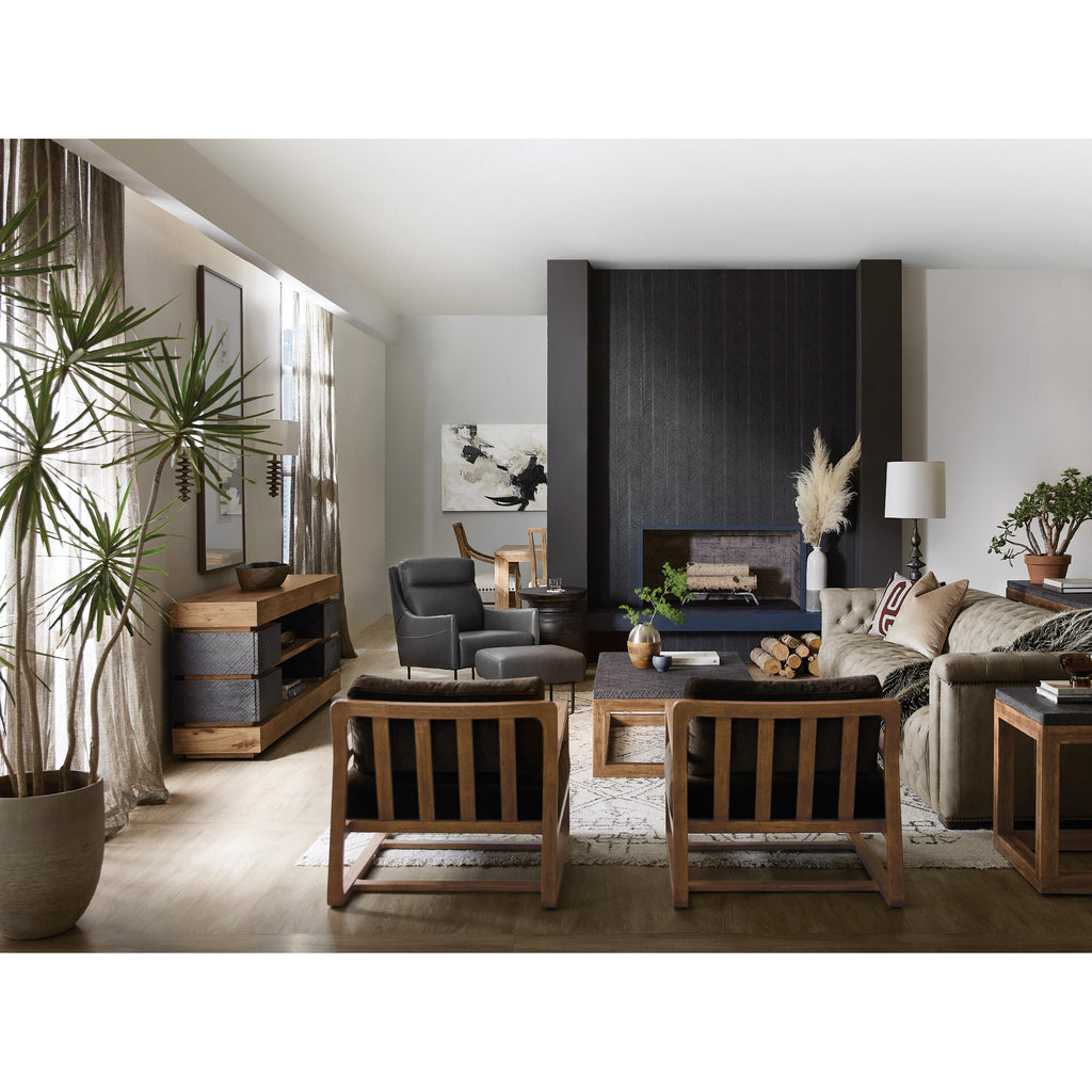 • Frame Construction: Hooker Furniture uses carefully chosen solid wood and select wood veneers over durable wood products in our furniture construction. Use of veneers enables more decorative looks unattainable with solid wood. Veneers are used over durable wood products such as medium density fiberboard (MDF) and particle board, made of renewable resources. MDF and particle board are used in quality furniture for areas that need to be stable, such as large surfaces. These durable wood products do not expand and contract with heat and cold and do not absorb moisture as much as solid wood, which results in stronger and longer-lasting furniture.