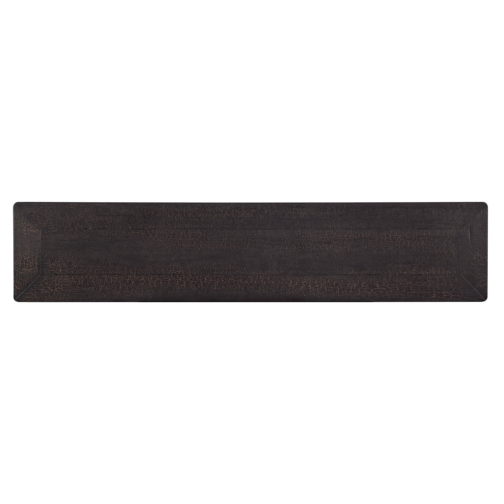 • Finish: Charred Timber: inspired by the restorative beauty of a fire-ravaged forest. Distressing includes worm holes, rasping, gauging, plane shock, hand plane, drawknife, wire brush and screw head. Dark brushed bronze metal bar pull.
