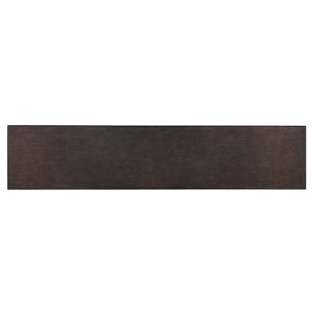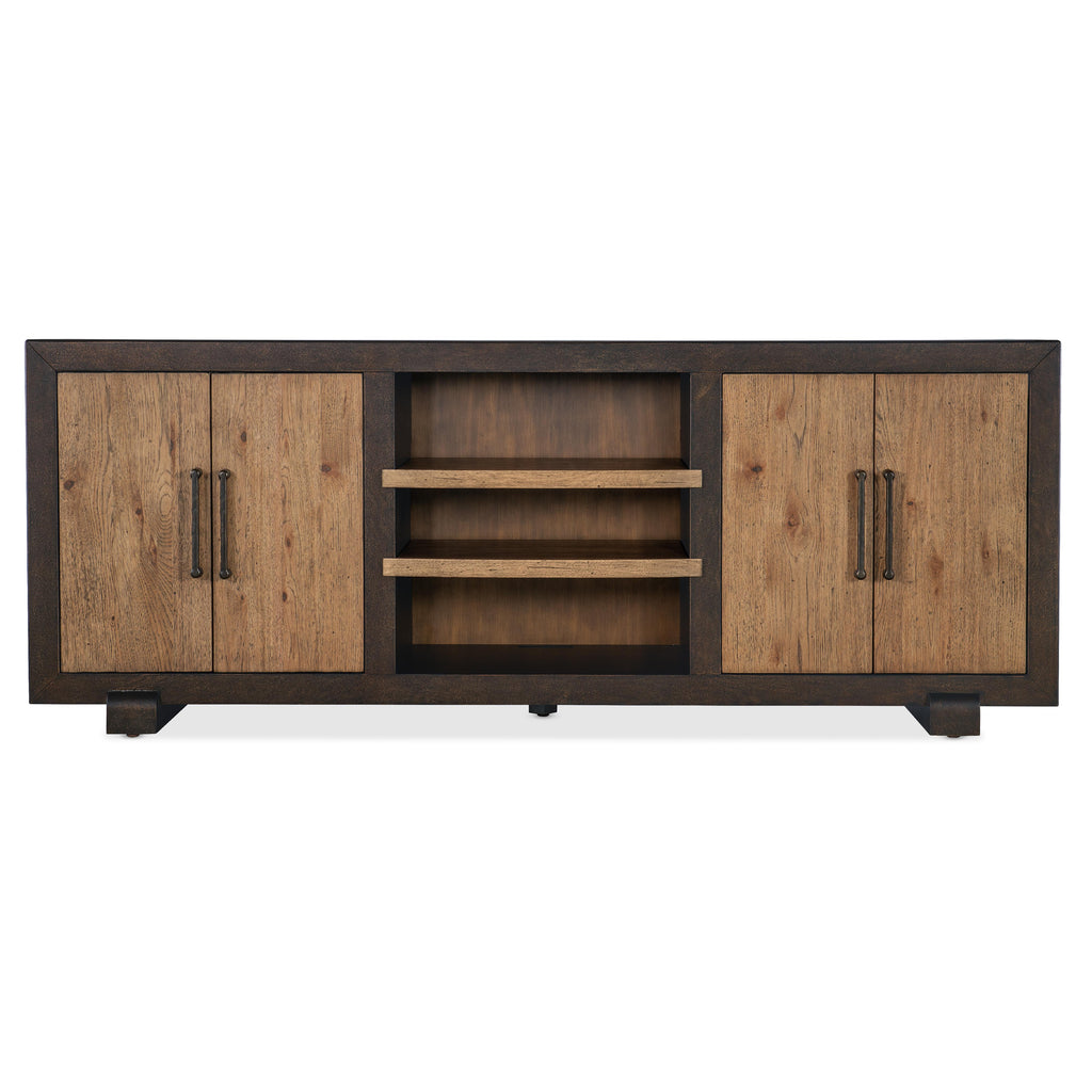 • Finish: Dusk finish on exterior: Dark, rubbed bronze metallic-like finish with a gesso texture. Vintage Natural finish on door fronts and center shelves: a warm, rustic, organic finish over hickory veneers. Distressing includes chopping, rock, drawknife, gauging, chain distressing and wire brush.