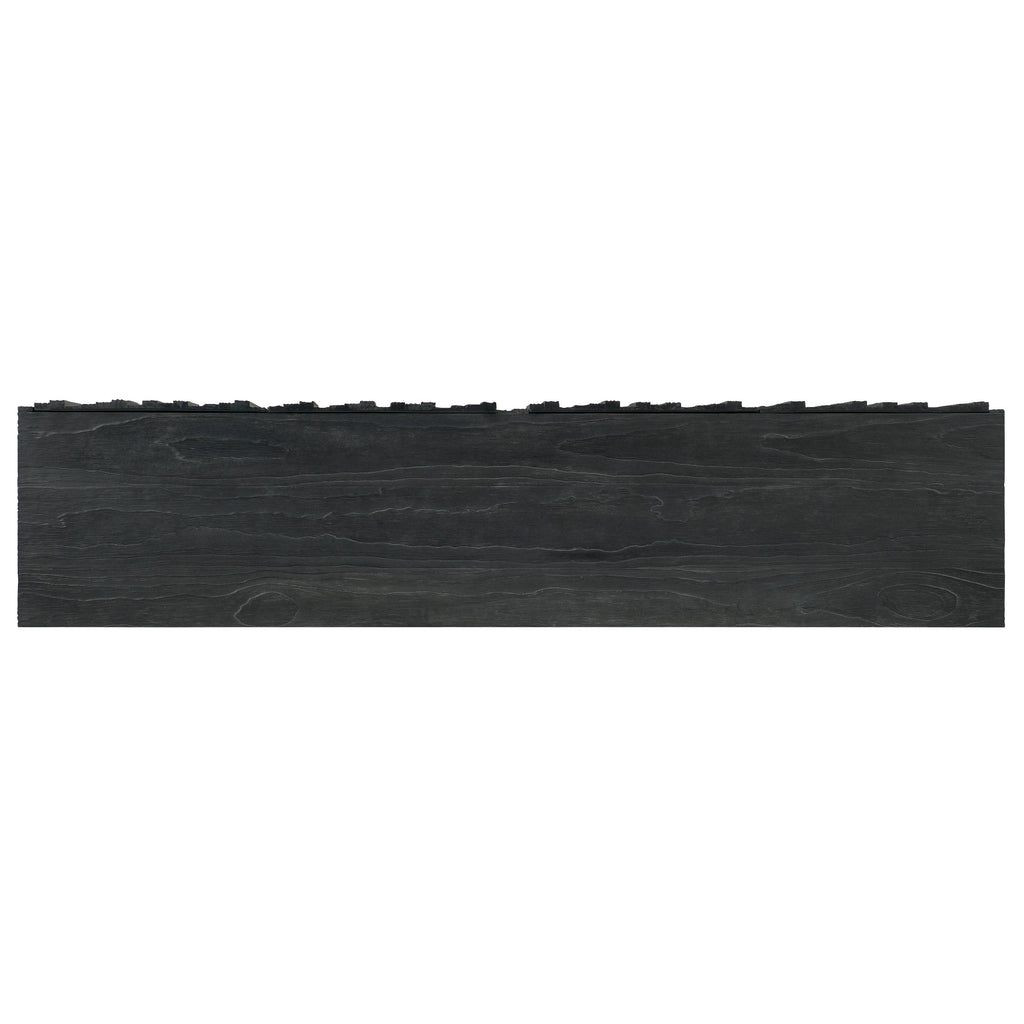 • Finish: The Charred Black finish is achieved through Shou Sugi Ban, a Japanese technique that creates a look resembling burnt wood. Accent pewter finish on base to simulate metal. Distressing includes sandblasting, wirebrushing, wormholes, and rock distressing.