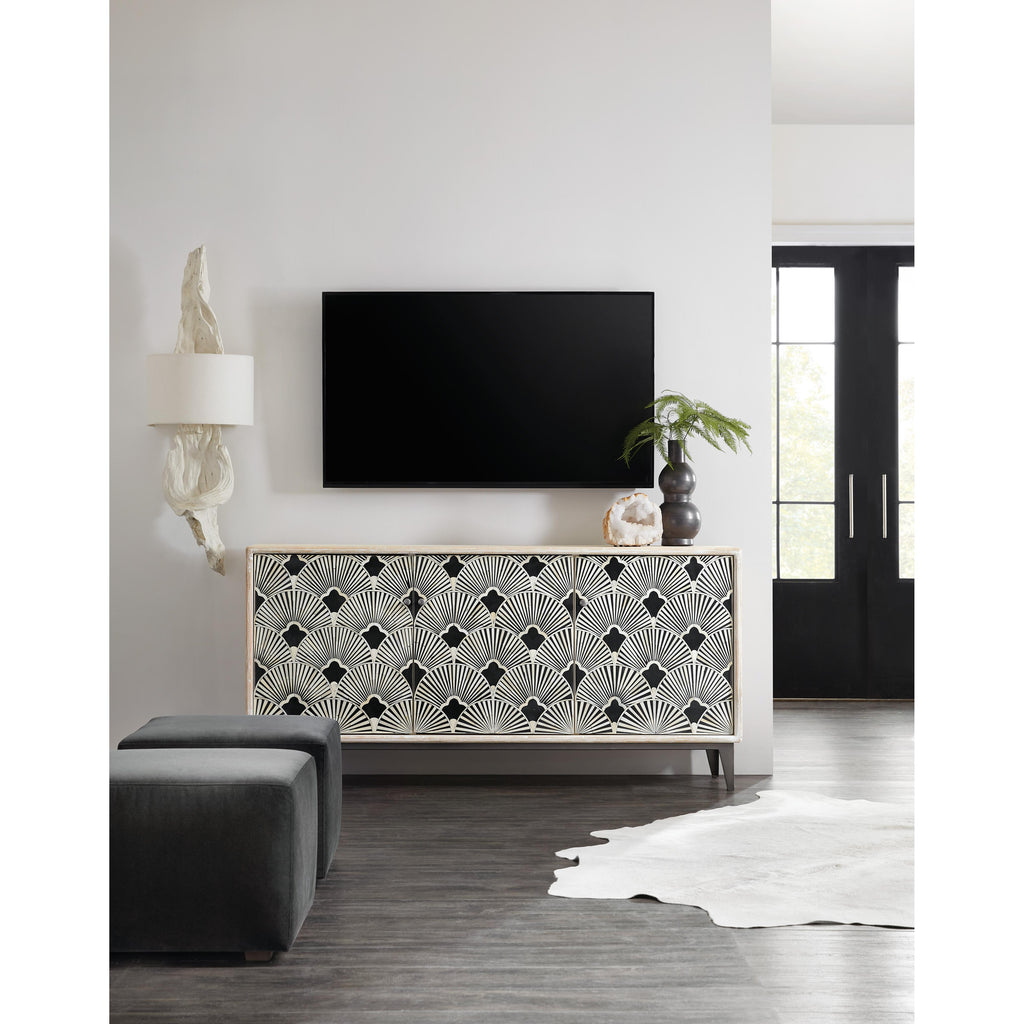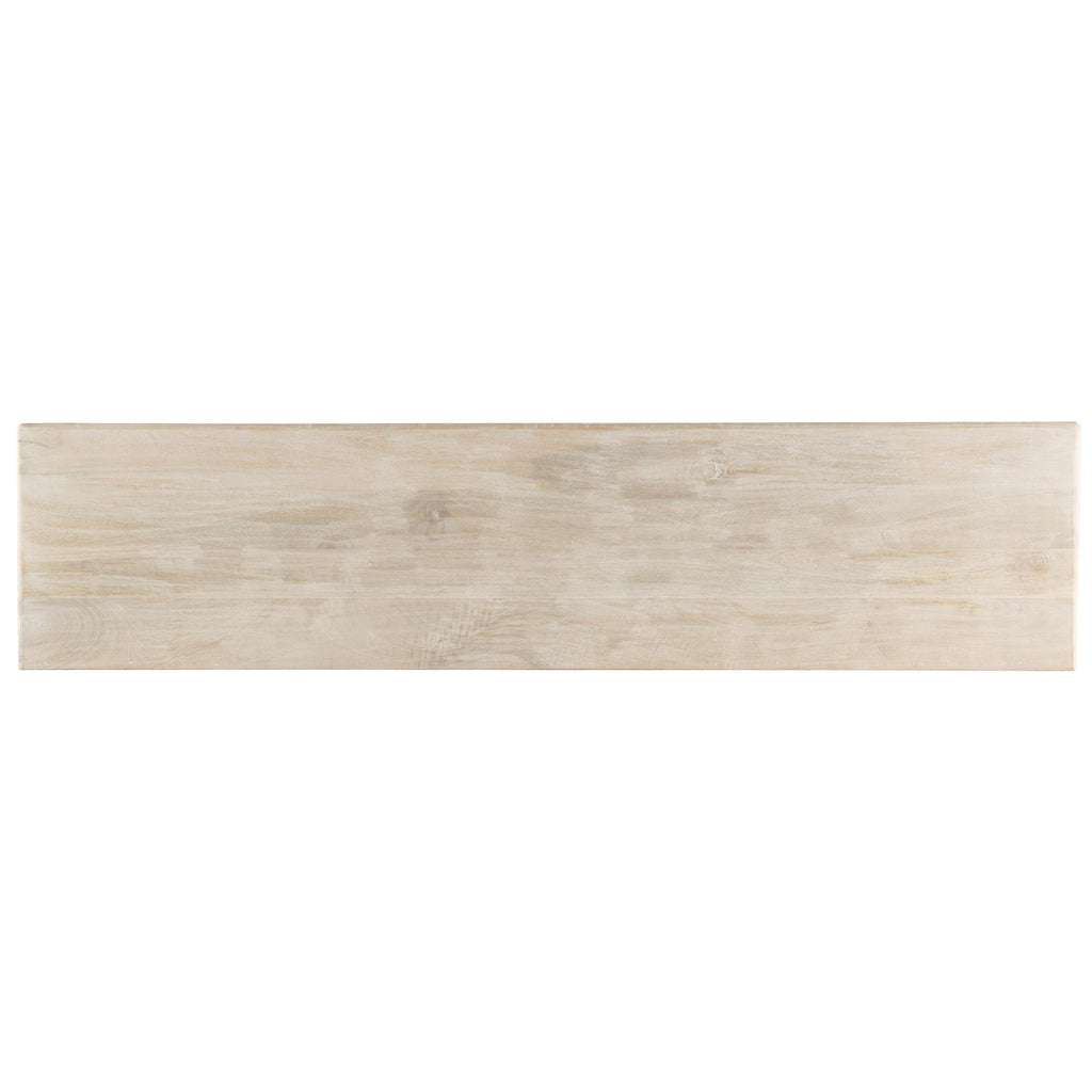 • Finish: Light natural wood finish on outside of case with off-white painted interior and black and white bone inlay on the door fronts. Gray metal base and hardware. Distressing includes wire brushing.