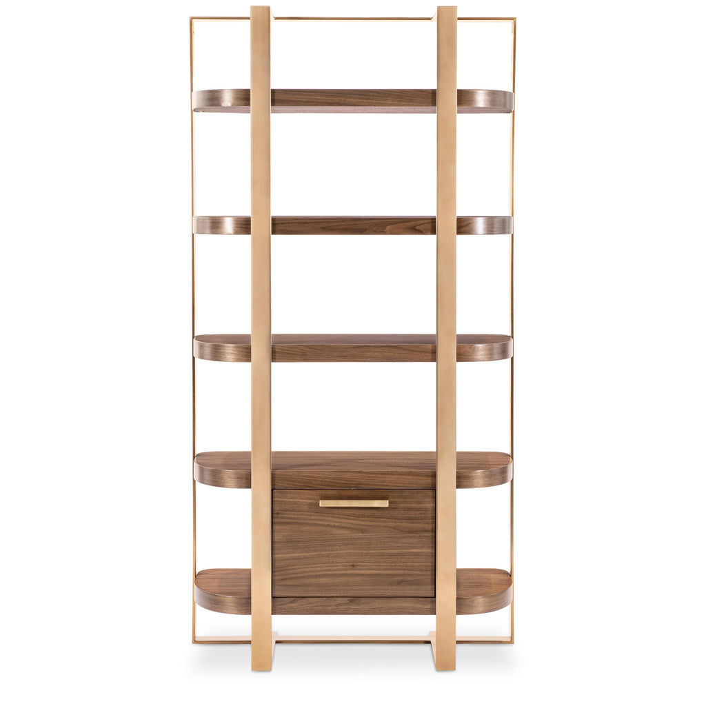 • Finish: Light Caramel finish featured on split-heart and quartered walnut veneers. Metal uprights featured in plated Sunlit Bronze metal finish.