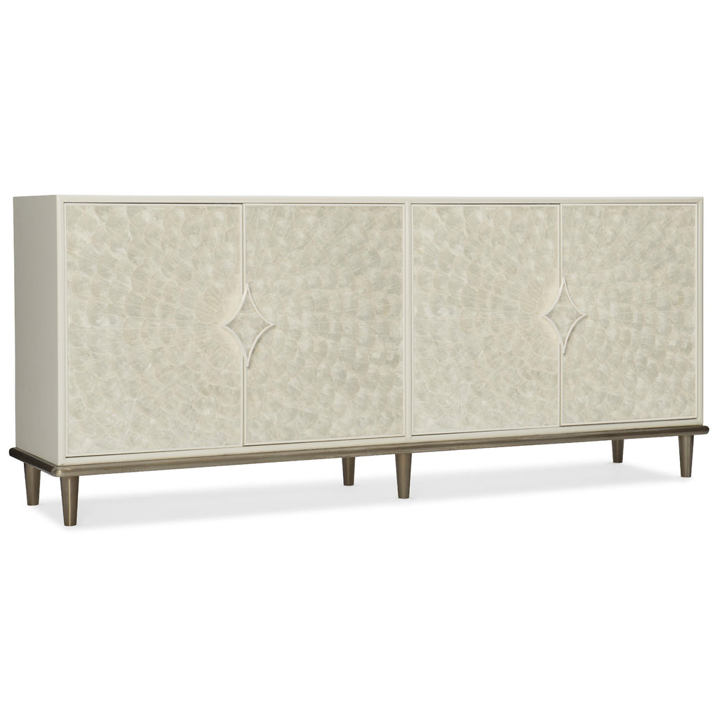 • Finish: Creamy white finish with a little shimmer, capiz shell inlay on doors and silver-color metal base trim and metal feet.