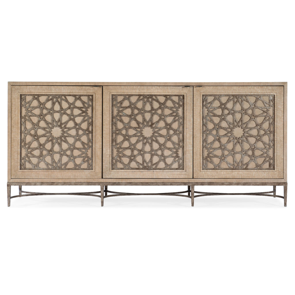 • Finish: Pearl exterior finish contrasting fretwork on doors, antique metal fretwork and tab pulls. Taupe colored interior.