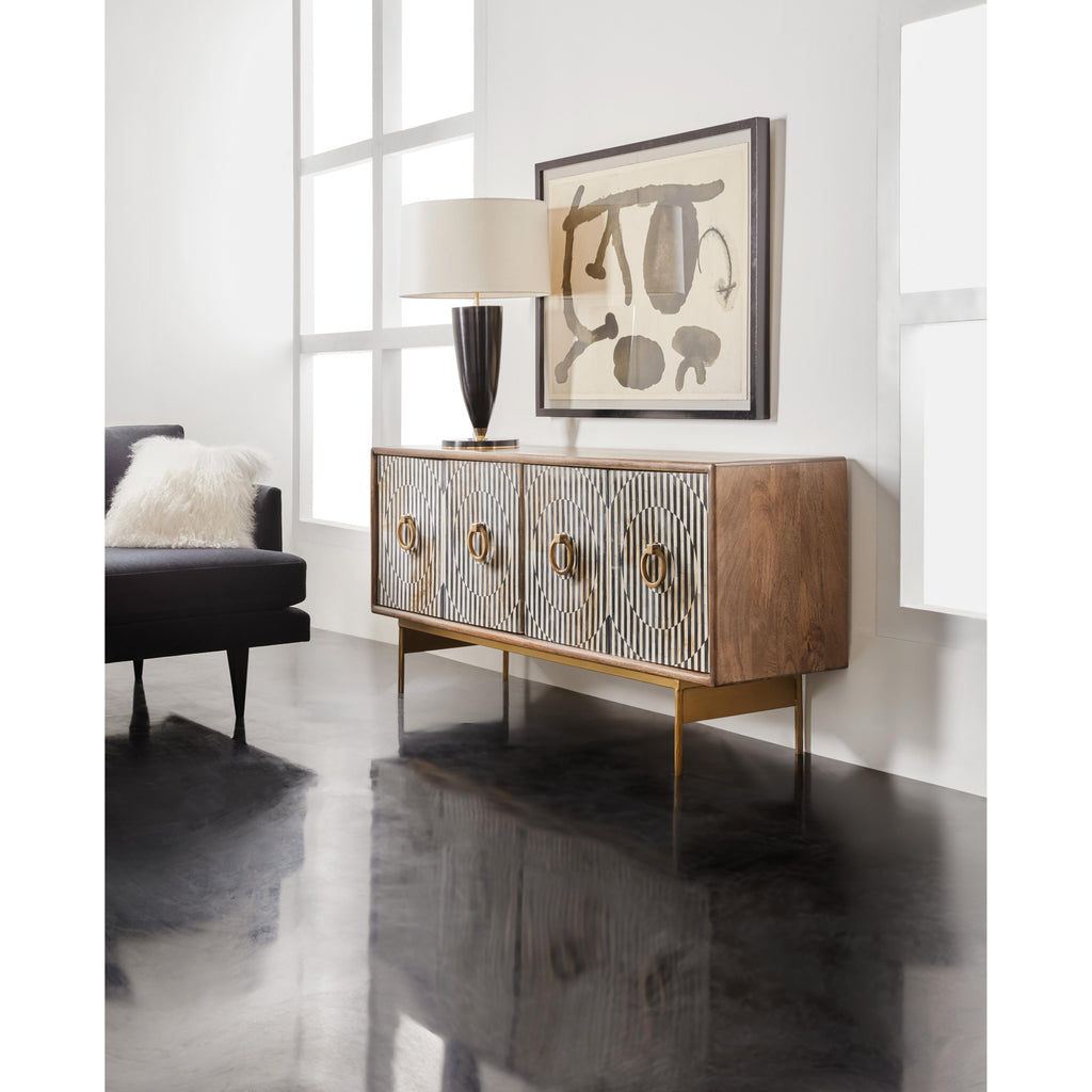 • Finish: Medium wood finish on body of case with black and white bone inlay on door fronts with brushed gold metal ring pulls and gold metal base
