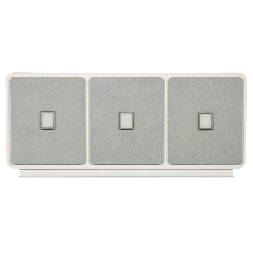 • Finish: Creamy white finish with gray raffia wrapped doors with hints of blue. Large square shaped hardware is silver colored metal with white painted glass