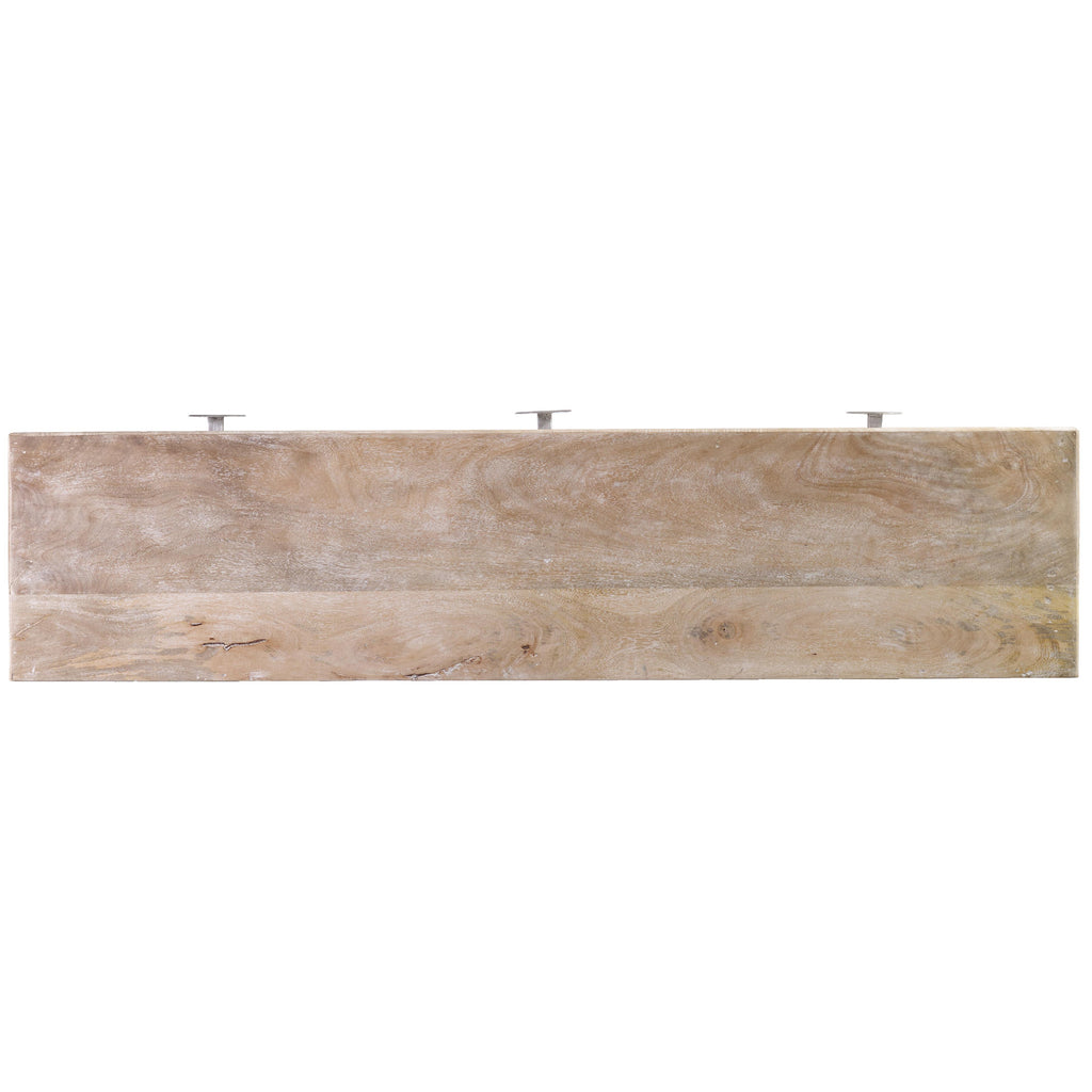 • Finish: White wash wood finish with metal base. Distressing includes sandblasting.