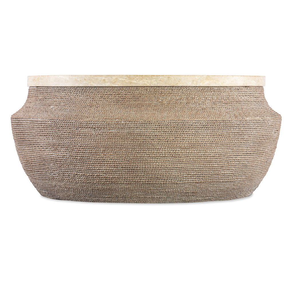 • Finish: Travertine marble veneer top features brown, beige, gray and cream colors. Brown rope wrapping.