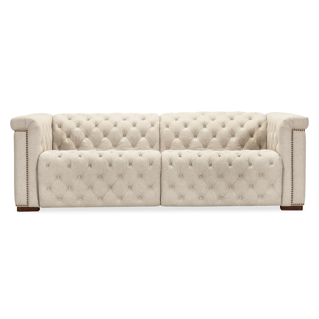 • Classic chesterfield tufting with copper toned accent nail trim