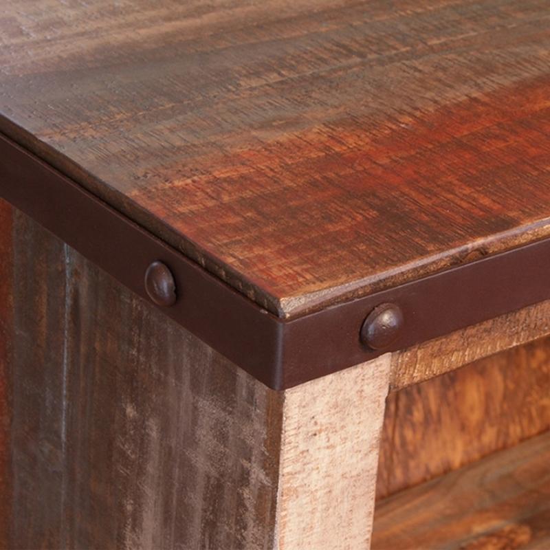 Tapered feet; Metal trim with nail head accenting; Distressed finish