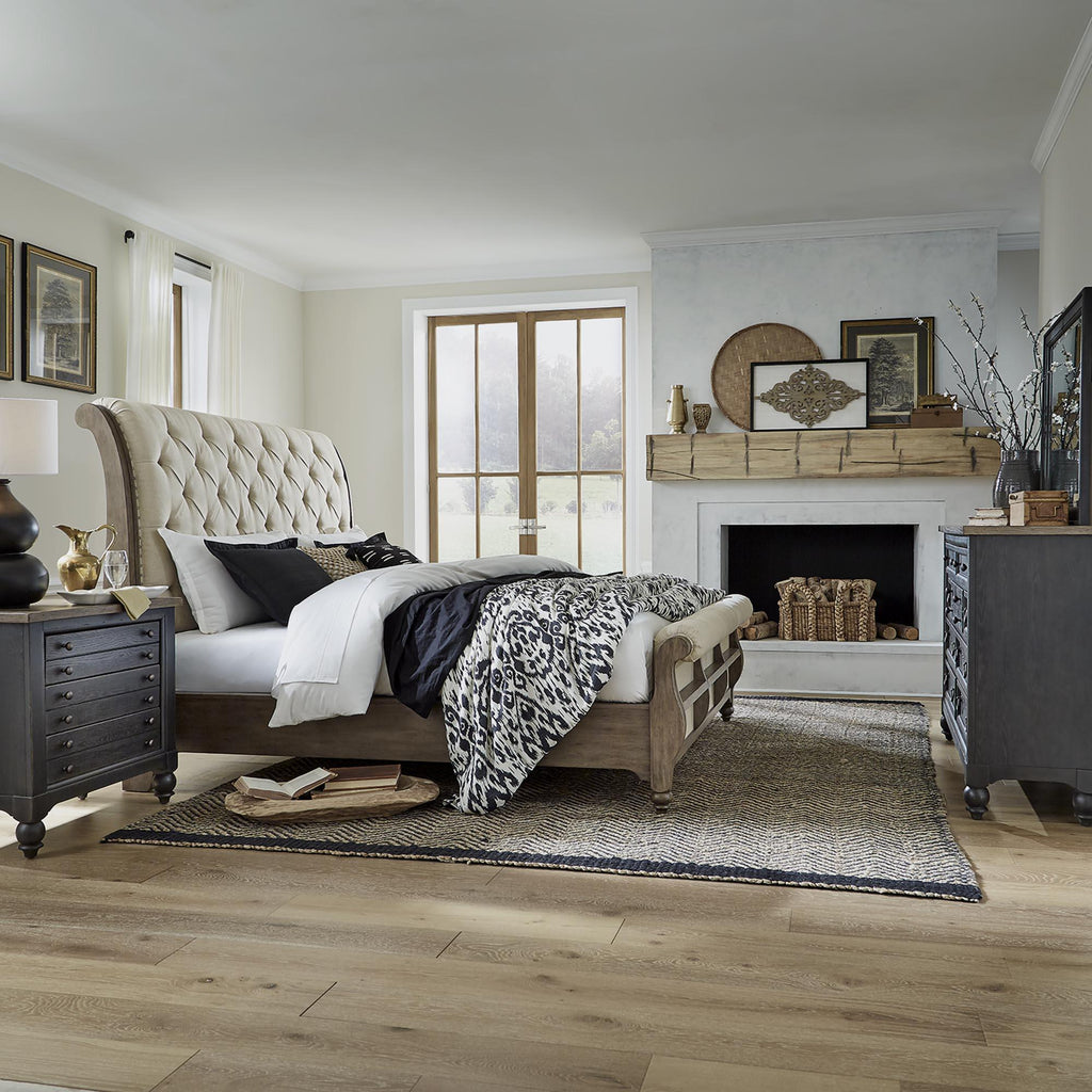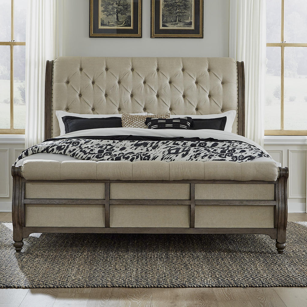 • Button-tufted upholstered headboard