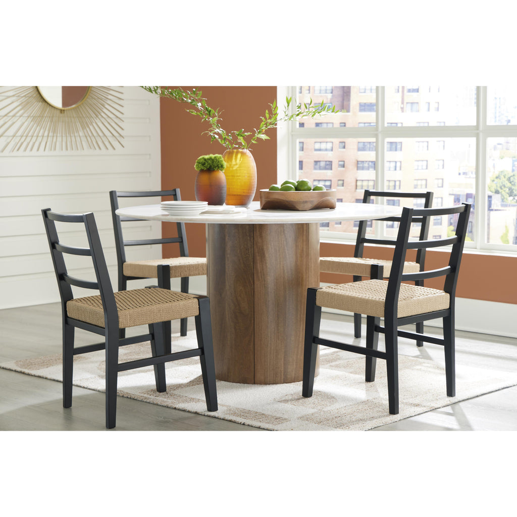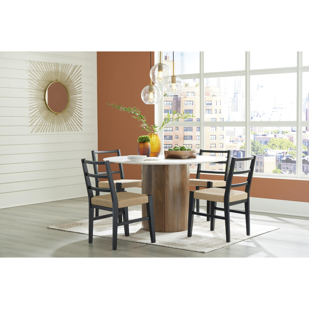 • Woven synthetic rattan seat in a light finish