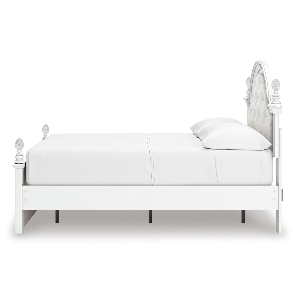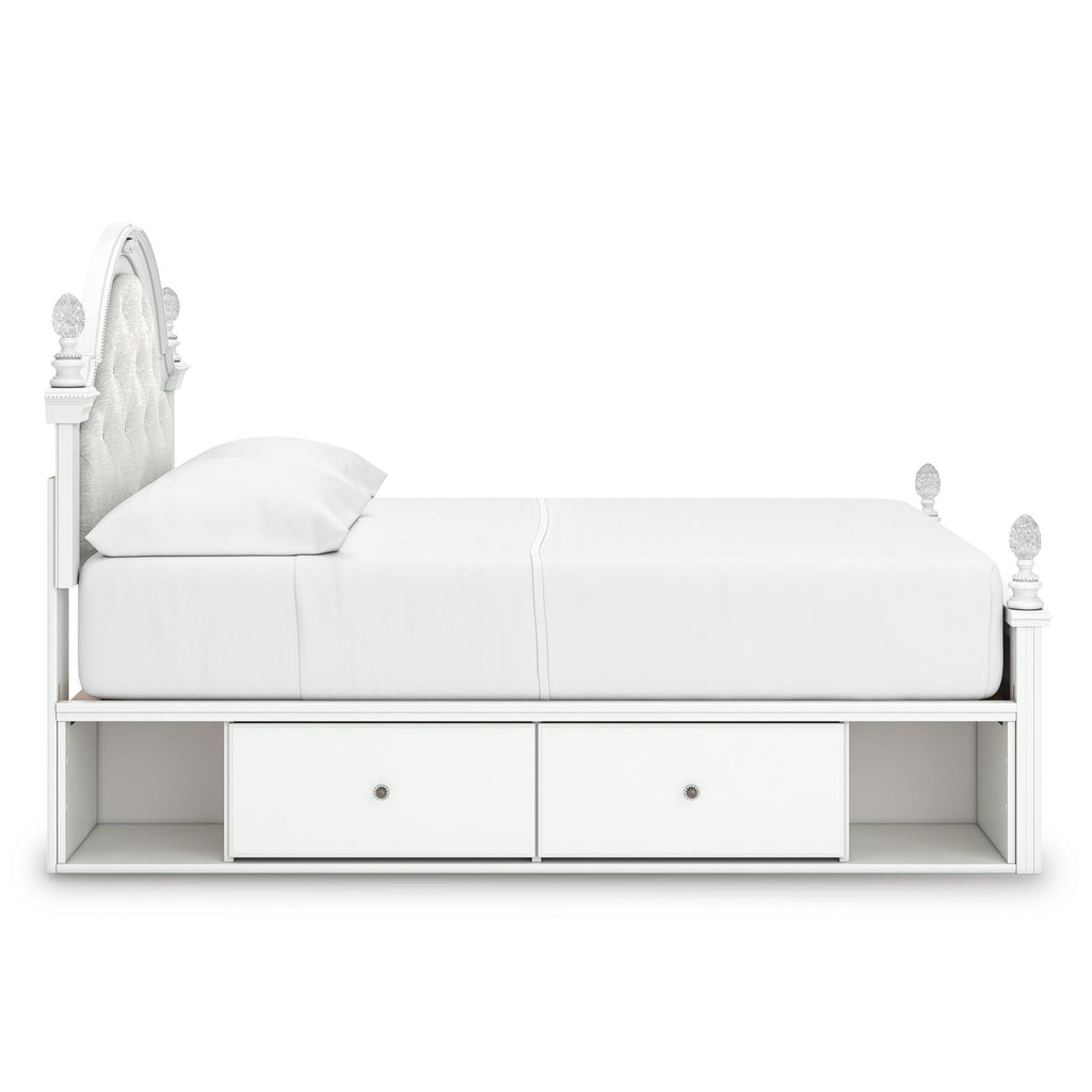 • Includes upholstered panel headboard, panel footboard, roll slats and side storage with rails