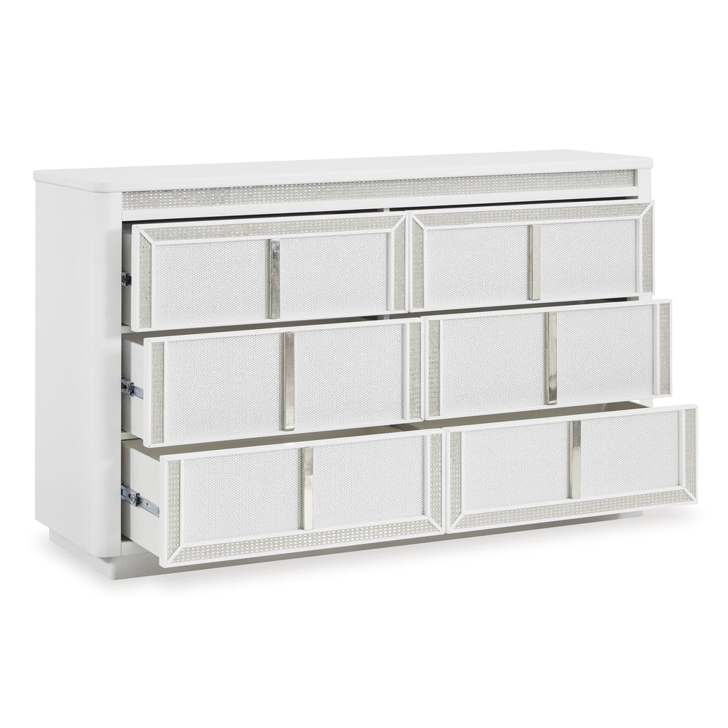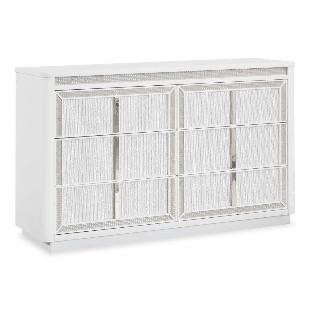 • Drawers with rhinestone frames; textured laminate drawer fronts