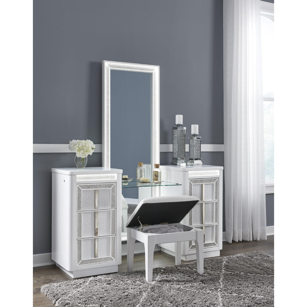 • Drawers with rhinestone frames; textured laminate drawer fronts