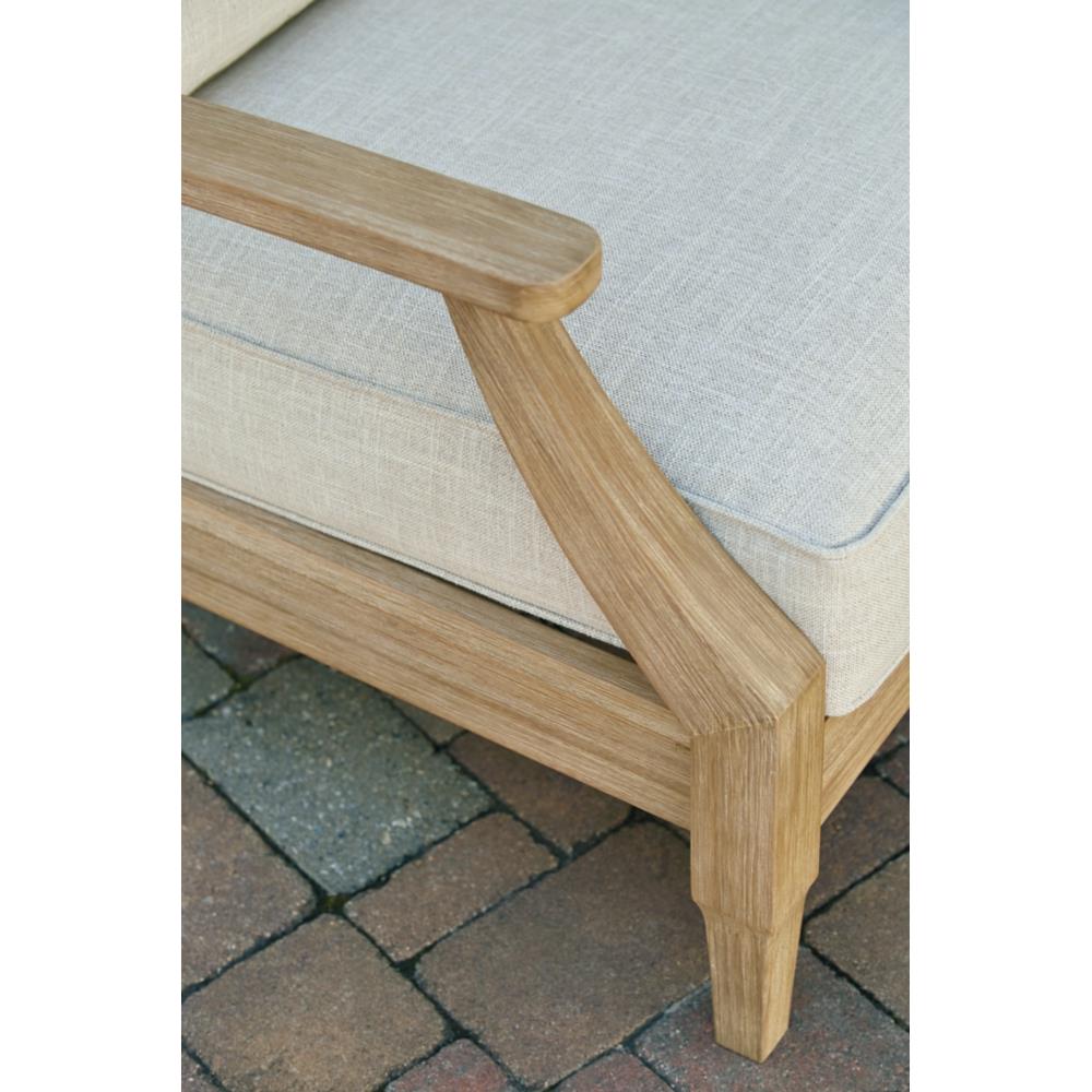 An effortlessly elegant choice in outdoor furniture, this outdoor seating set delightfully combines sturdiness and style. For that much more... An effortlessly elegant choice in outdoor furniture, this outdoor seating set delightfully combines sturdiness and style. For that much more weather protection, the eucalyptus wood frame with tapered touches and slat styling is treated with a 5-step finishing process. Sumptuously soft yet remarkably durable, the included cushions and colorful throw pillows are wrapped in a high-performing, low-maintenance Nuvella® fabric you’re sure to love. This set includes an outdoor sofa, loveseat, and lounge chair. View more