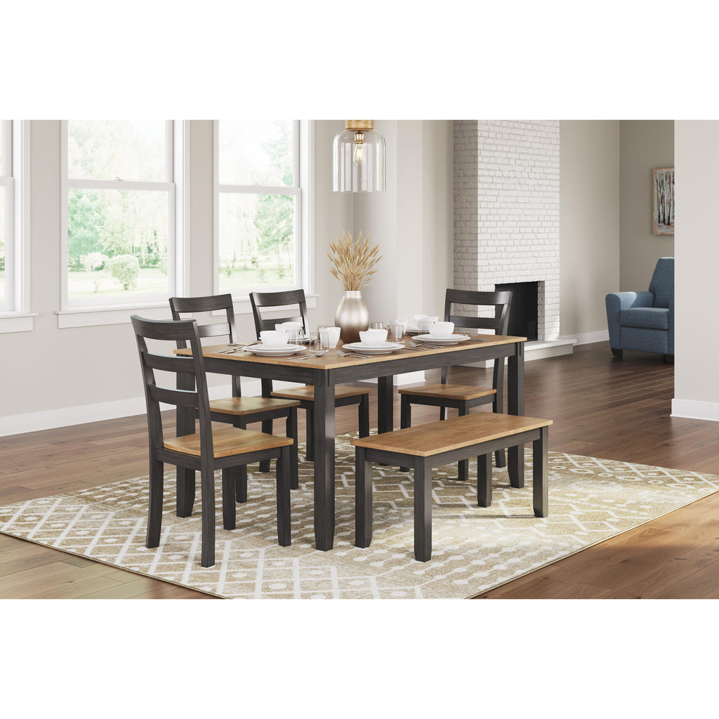 • 2-tone finish (tabletop, chair seats and bench seat with light natural mango wood finish; table base and chair frames with dark brown finish)