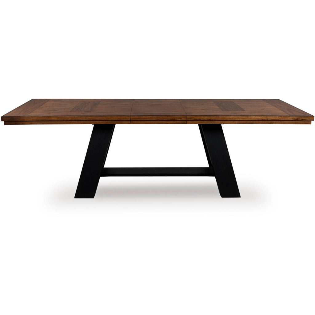 • Two-tone finish (mindi wood veneer inlay top with medium brown finish; base with painted black finish)
