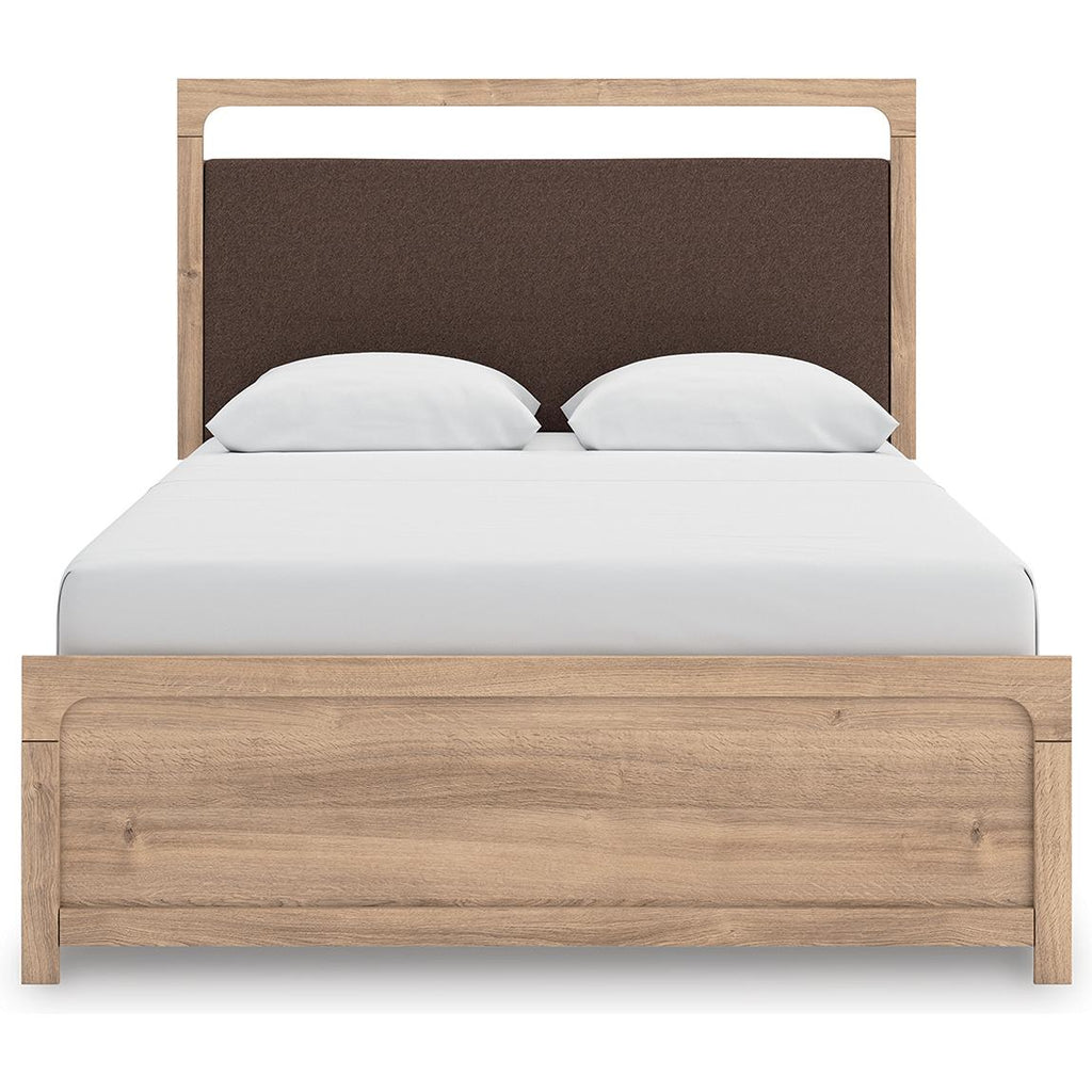 • Includes upholstered panel headboard, panel footboard, platform rails and roll slats
