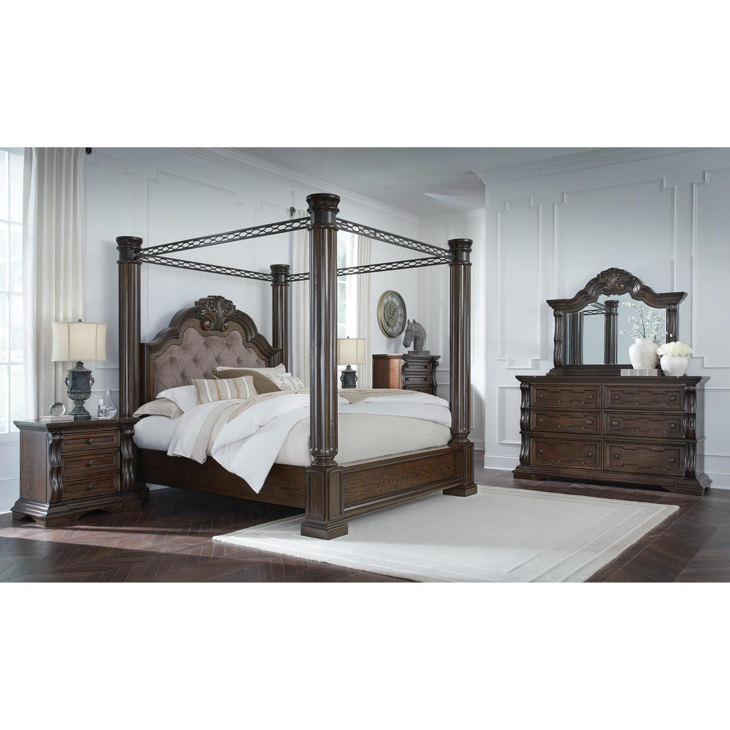 • Includes upholstered poster headboard panel, poster footboard panel, rails, slats, posts and canopy
