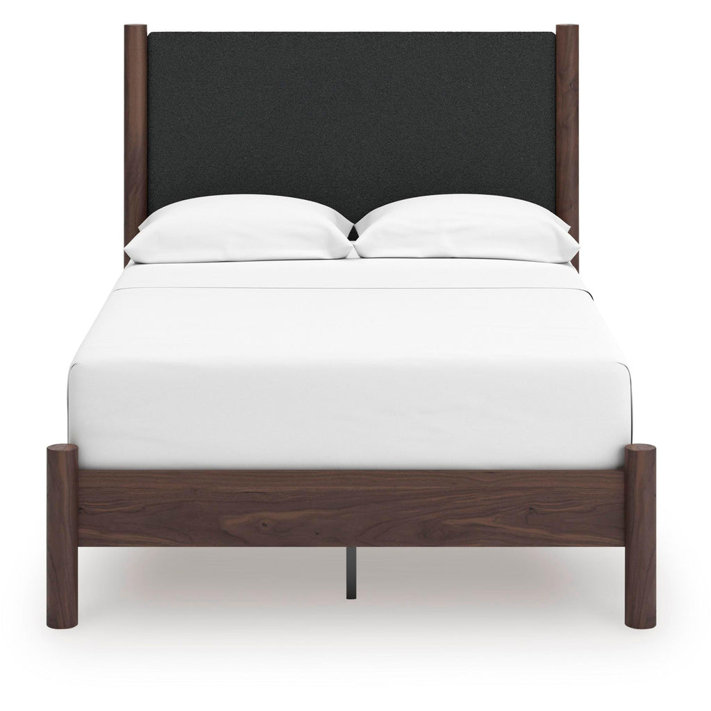 • Includes upholstered panel headboard, platform footboard with rails and roll slats