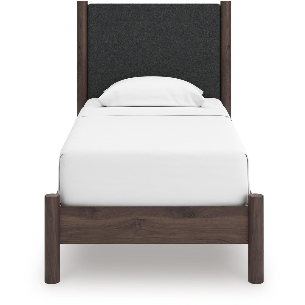 • Includes upholstered panel headboard, platform footboard with rails and roll slats